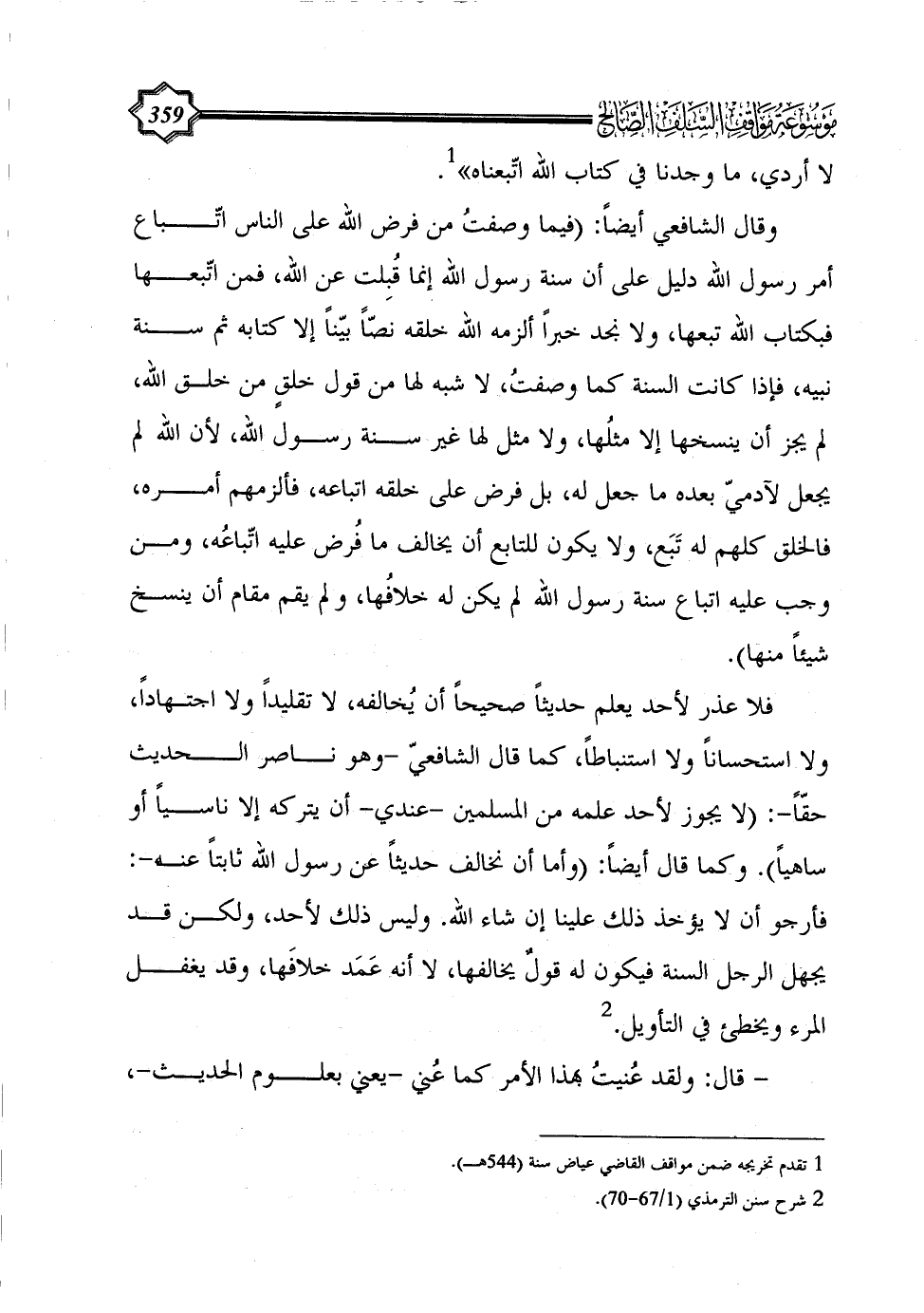 وقال الشافعي أيضاً: (فيما وصفتُ من فرض الله على الناس اتّباع أمر رسول الله دليل على أن سنة رسول الله إنما قُبِلت عن الله، فمن اتّبعها فبكتاب الله تبعها، ولا نجد خبراً ألزمه الله خلقه نصّاً بيّناً إلا كتابه ثم سنة نبيه، فإذا كانت السنة كما وصفتُ، لا شبه لها من قول خلقٍ من خلق الله، لم يجز أن ينسخها إلا مثلُها، ولا مثل لها غير سنة رسول الله، لأن الله لم يجعل لآدميّ بعده ما جعل له، بل فرض على خلقه اتباعه، فألزمهم أمره، فالخلق كلهم له تَبَع، ولا يكون للتابع أن يخالف ما فُرض عليه اتّباعُه، ومن وجب عليه اتباع سنة رسول الله لم يكن له خلافُها، ولم يقم مقام أن ينسخ شيئاً منها).