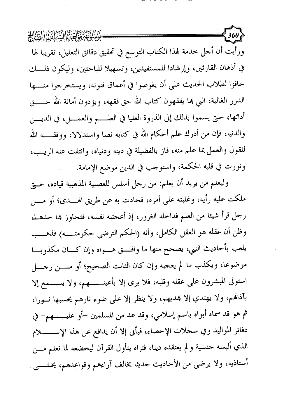 ورأيتُ أن أجلّ خدمة لهذا الكتاب التوسعُ في تحقيق دقائق التعليل، تقريباً لها في أذهان القارئين، وإرشاداً للمستفيدين، وتسهيلاً للباحثين، وليكون ذلك حافزاً لطلاّب الحديث على أن يغوصوا في أعماق فنونه، ويستخرجوا منها الدرر الغالية، التي بها يفقهون كتاب الله حقّ فقهه، ويؤدّون أمانة الله حقّ أدائها، حتى يَسْمُوا بذلك إلى الذّروة العليا في العلم والعمل، في الدين والدنيا، فإن من أدرك علم أحكام الله في كتابه نصّاً واستدلالاً، ووفّقه الله للقول والعمل بما علم منه، فاز بالفضيلة في دينه ودنياه، وانتفت عنه الرِّيَب، ونوّرت في قلبه الحكمة، واستوجب في الدين موضع الإمامة.