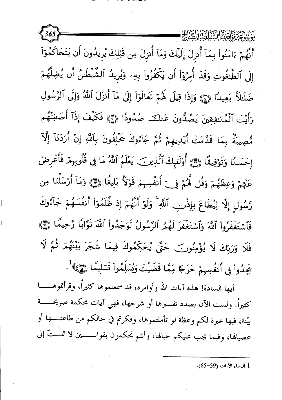 أَنَّهُمْ آَمَنُوا بِمَا أُنْزِلَ إِلَيْكَ وَمَا أُنْزِلَ مِنْ قَبْلِكَ يُرِيدُونَ أَنْ يَتَحَاكَمُوا إِلَى الطَّاغُوتِ وَقَدْ أُمِرُوا أَنْ يَكْفُرُوا بِهِ وَيُرِيدُ الشَّيْطَانُ أَنْ يُضِلَّهُمْ ضَلَالًا بَعِيدًا (60) وَإِذَا قِيلَ لَهُمْ تَعَالَوْا إِلَى مَا أَنْزَلَ اللَّهُ وَإِلَى الرَّسُولِ رَأَيْتَ الْمُنَافِقِينَ يَصُدُّونَ عَنْكَ صُدُودًا (61) فَكَيْفَ إِذَا أَصَابَتْهُمْ مُصِيبَةٌ بِمَا قَدَّمَتْ أَيْدِيهِمْ ثُمَّ جَاءُوكَ يَحْلِفُونَ بِاللَّهِ إِنْ أَرَدْنَا إِلَّا إِحْسَانًا وَتَوْفِيقًا (62) أُولَئِكَ الَّذِينَ يَعْلَمُ اللَّهُ مَا فِي قُلُوبِهِمْ فَأَعْرِضْ عَنْهُمْ وَعِظْهُمْ وَقُلْ لَهُمْ فِي أَنْفُسِهِمْ قَوْلًا بَلِيغًا (63) وَمَا أَرْسَلْنَا مِنْ رَسُولٍ إِلَّا لِيُطَاعَ بِإِذْنِ اللَّهِ وَلَوْ أَنَّهُمْ إِذْ ظَلَمُوا أَنْفُسَهُمْ جَاءُوكَ فَاسْتَغْفَرُوا اللَّهَ وَاسْتَغْفَرَ لَهُمُ الرَّسُولُ لَوَجَدُوا اللَّهَ تَوَّابًا رَحِيمًا (64) فَلَا وَرَبِّكَ لَا يُؤْمِنُونَ حَتَّى يُحَكِّمُوكَ فِيمَا شَجَرَ بَيْنَهُمْ ثُمَّ لَا يَجِدُوا فِي أَنْفُسِهِمْ حَرَجًا مِمَّا قَضَيْتَ وَيُسَلِّمُوا تَسْلِيمًا (65)} (¬1).