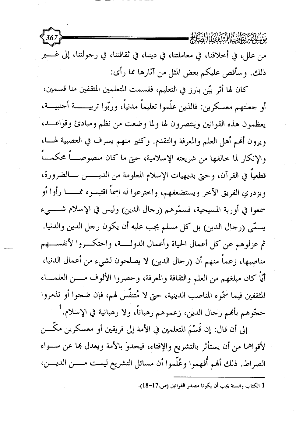 إلى أن قال: إن قَسْمَ المتعلمين في الأمة إلى فريقين أو معسكرين مكّن لأقواهما من أن يستأثر بالتشريع والإفتاء، فيحدوَ بالأمة ويعدل بها عن سواء الصراط. ذلك أنهم أُفهموا وعُلّموا أن مسائل التشريع ليست من الدين،