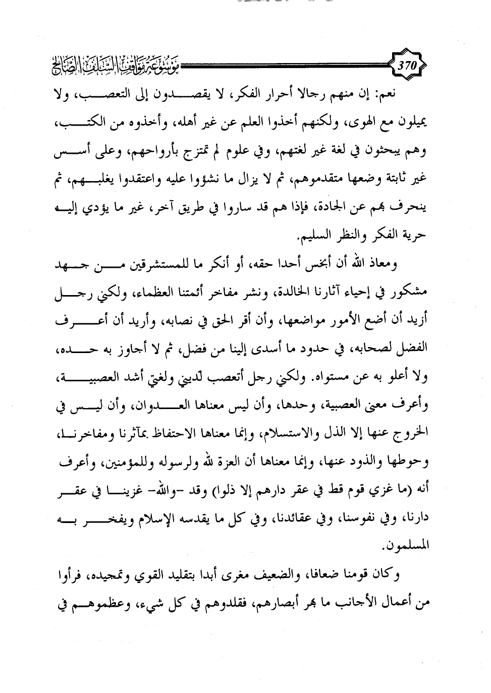 ومعاذ الله أن أبخس أحداً حقّه، أو أنكر ما للمستشرقين من جهد مشكور في إحياء آثارنا الخالدة، ونشر مفاخر أئمتنا العظماء، ولكني رجل أريد أن أضع الأمور مواضعها، وأن أقرّ الحق في نصابه، وأريد أن أعرف الفضل لصحابه، في حدود ما أسدى إلينا من فضل، ثم لا أجاوز به حدّه، ولا أعلو به عن مستواه. ولكني رجل أتعصب لديني ولغتي أشدّ العصبية، وأعرف معنى العصبية، وحدّها، وأن ليس معناها العدوان، وأن ليس في الخروج عنها إلا الذلّ والاستسلام، وإنما معناها الاحتفاظ بمآثرنا ومفاخرنا، وحَوطها والذود عنها، وإنما معناها أن العزة لله ولرسوله وللمؤمنين، وأعرف أنه (ما غُزي قومٌ قطّ في عقر دارهم إلا ذلّوا) وقد -والله- غُزينا في عقر دارنا، وفي نفوسنا، وفي عقائدنا، وفي كل ما يقدّسه الإسلام ويفخر به المسلمون.
