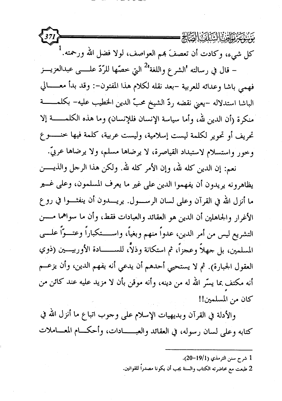 - قال في رسالته 'الشرع واللغة' (¬2) التي خصّها للرّدّ على عبد العزيز فهمي باشا وعدائه للعربية -بعد نقله لكلام هذا المفتون-: وقد بدأ معالي الباشا استدلاله -يعني نقضه ردّ الشيخ محبّ الدين الخطيب عليه- بكلمة منكرة (أن الدين لله، وأما سياسة الإنسان فللإنسان) وما هذه الكلمة إلا تحريف أو تحوير لكلمة ليست إسلامية، وليست عربية، كلمة فيها خنوع وخور واستسلام لاستبداد القياصرة، لا يرضاها مسلم، ولا يرضاها عربيّ.