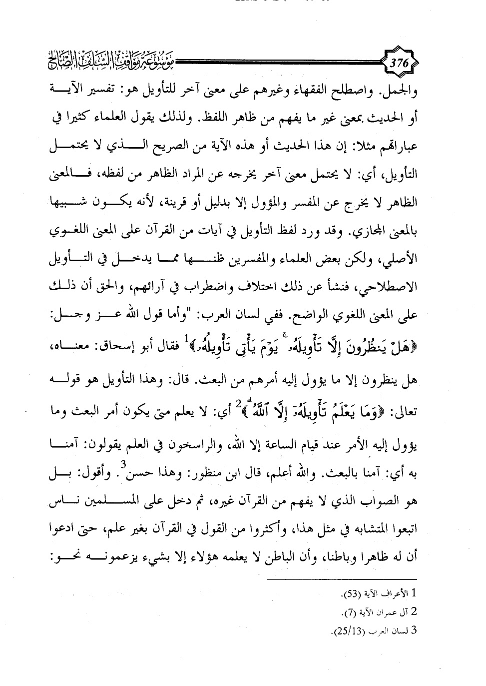 والجمل. واصطلح الفقهاء وغيرهم على معنى آخر للتأويل هو: تفسير الآية أو الحديث بمعنى غير ما يفهم من ظاهر اللفظ. ولذلك يقول العلماء كثيرا في عباراتهم مثلا: إن هذا الحديث أو هذه الآية من الصريح الذي لا يحتمل التأويل، أي: لا يحتمل معنى آخر يخرجه عن المراد الظاهر من لفظه، فالمعنى الظاهر لا يخرج عن المفسر والمؤول إلا بدليل أو قرينة، لأنه يكون شبيها بالمعنى المجازي. وقد ورد لفظ التأويل في آيات من القرآن على المعنى اللغوي الأصلي، ولكن بعض العلماء والمفسرين ظنها مما يدخل في التأويل الاصطلاحي، فنشأ عن ذلك اختلاف واضطراب في آرائهم، والحق أن ذلك على المعنى اللغوي الواضح. ففي لسان العرب: "وأما قول الله عز وجل: {هَلْ يَنْظُرُونَ إِلَّا تَأْوِيلَهُ يَوْمَ يَأْتِي تَأْوِيلُهُ} (¬1) فقال أبو إسحاق: معناه، هل ينظرون إلا ما يؤول إليه أمرهم من البعث. قال: وهذا التأويل هو قوله تعالى: {وَمَا يَعْلَمُ تَأْوِيلَهُ إِلَّا اللَّهُ} (¬2) أي: لا يعلم متى يكون أمر البعث وما يؤول إليه الأمر عند قيام الساعة إلا الله، والراسخون في العلم يقولون: آمنا به أي: آمنا بالبعث. والله أعلم، قال ابن منظور: وهذا حسن (¬3).