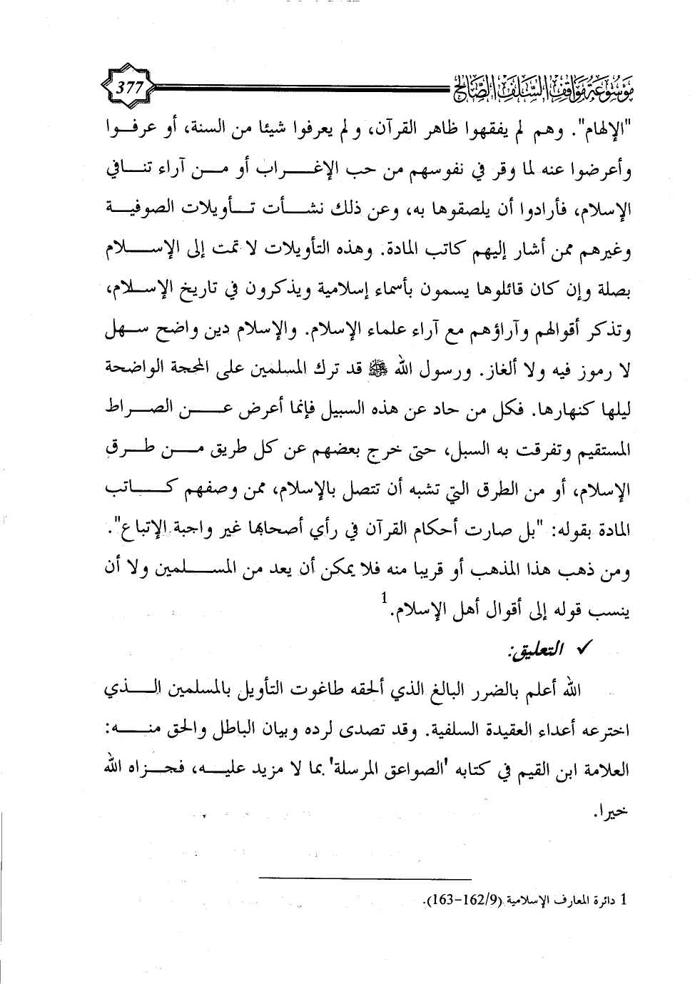 "الإلهام". وهم لم يفقهوا ظاهر القرآن، ولم يعرفوا شيئا من السنة، أو عرفوا وأعرضوا عنه لما وقر في نفوسهم من حب الإغراب أو من آراء تنافي الإسلام، فأرادوا أن يلصقوها به، وعن ذلك نشأت تأويلات الصوفية وغيرهم ممن أشار إليهم كاتب المادة. وهذه التأويلات لا تمت إلى الإسلام بصلة وإن كان قائلوها يسمون بأسماء إسلامية ويذكرون في تاريخ الإسلام، وتذكر أقوالهم وآراؤهم مع آراء علماء الإسلام. والإسلام دين واضح سهل لا رموز فيه ولا ألغاز. ورسول الله - صلى الله عليه وسلم - قد ترك المسلمين على المحجة الواضحة ليلها كنهارها. فكل من حاد عن هذه السبيل فإنما أعرض عن الصراط المستقيم وتفرقت به السبل، حتى خرج بعضهم عن كل طريق من طرق الإسلام، أو من الطرق التي تشبه أن تتصل بالإسلام، ممن وصفهم كاتب المادة بقوله: "بل صارت أحكام القرآن في رأي أصحابها غير واجبة الإتباع". ومن ذهب هذا المذهب أو قريبا منه فلا يمكن أن يعد من المسلمين ولا أن ينسب قوله إلى أقوال أهل الإسلام. (¬1)