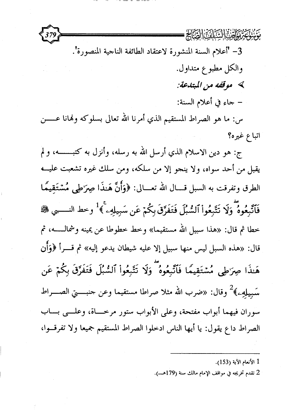 ج: هو دين الاسلام الذي أرسل الله به رسله، وأنزل به كتبه، ولم يقبل من أحد سواه، ولا ينجو إلا من سلكه، ومن سلك غيره تشعبت عليه الطرق وتفرقت به السبل قال الله تعالى: {وَأَنَّ هَذَا صِرَاطِي مُسْتَقِيمًا فَاتَّبِعُوهُ وَلَا تَتَّبِعُوا السُّبُلَ فَتَفَرَّقَ بِكُمْ عَنْ سَبِيلِهِ} (¬1) وخط النبي - صلى الله عليه وسلم - خطا ثم قال: «هذا سبيل الله مستقيما» وخط خطوطا عن يمينه وشماله، ثم قال: «هذه السبل ليس منها سبيل إلا عليه شيطان يدعو إليه» ثم قرأ {وَأَنْ هَذَا صِرَاطِي مُسْتَقِيمًا فَاتَّبِعُوهُ وَلَا تَتَّبِعُوا السُّبُلَ فَتَفَرَّقَ بِكُمْ عَنْ سَبِيلِهِ} (¬2) وقال: «ضرب الله مثلا صراطا مستقيما وعن جنبتي الصراط سوران فيهما أبواب مفتحة، وعلى الأبواب ستور مرخاة، وعلى باب الصراط داع يقول: يا أيها الناس ادخلوا الصراط المستقيم جميعا ولا تفرقوا،