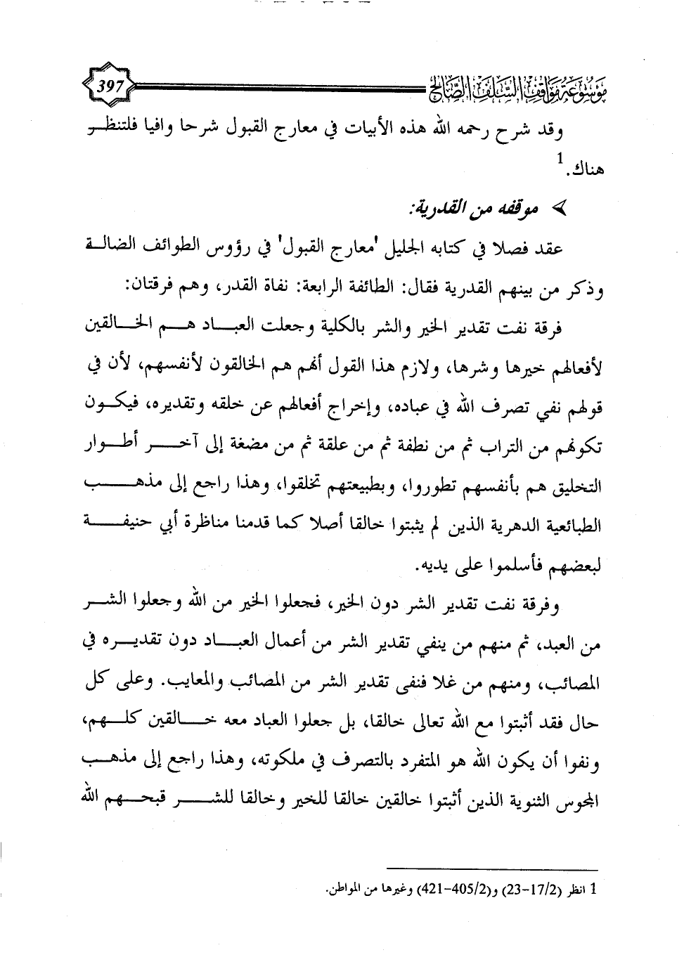 عقد فصلا في كتابه الجليل 'معارج القبول' في رؤوس الطوائف الضالة وذكر من بينهم القدرية فقال: الطائفة الرابعة: نفاة القدر، وهم فرقتان: