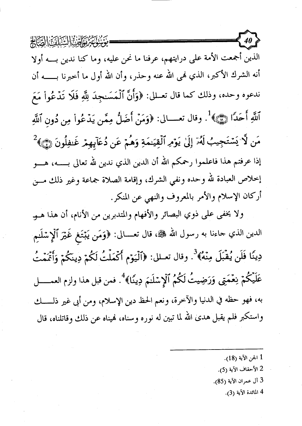 الذين أجمعت الأمة على درايتهم، عرفنا ما نحن عليه، وما كنا ندين به أولا أنه الشرك الأكبر، الذي نهى الله عنه وحذر، وأن الله أول ما أخبرنا به أن ندعوه وحده، وذلك كما قال تعالى: {وَأَنَّ الْمَسَاجِدَ لِلَّهِ فَلَا تَدْعُوا مَعَ اللَّهِ أَحَدًا (18)} (¬1). وقال تعالى: {وَمَنْ أَضَلُّ مِمَّنْ يَدْعُو مِنْ دُونِ اللَّهِ مَنْ لَا يَسْتَجِيبُ لَهُ إِلَى يَوْمِ الْقِيَامَةِ وَهُمْ عَنْ دعائهم غَافِلُونَ (5)} (¬2) إذا عرفتم هذا فاعلموا رحمكم الله أن الدين الذي ندين لله تعالى به، هو إخلاص العبادة لله وحده ونفي الشرك، وإقامة الصلاة جماعة وغير ذلك من أركان الإسلام والأمر بالمعروف والنهي عن المنكر.