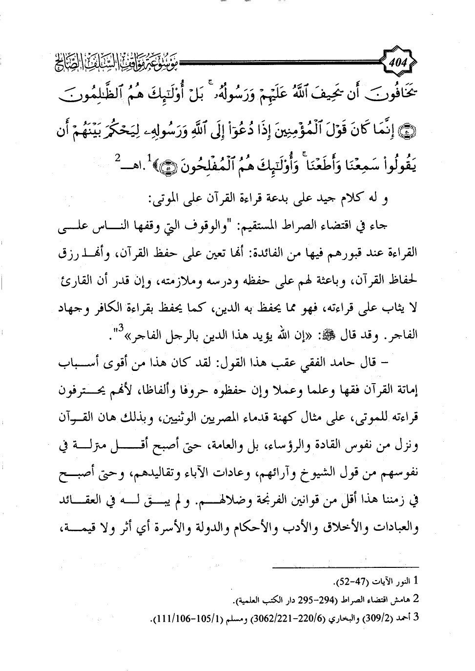 يَخَافُونَ أَنْ يَحِيفَ اللَّهُ عَلَيْهِمْ وَرَسُولُهُ بَلْ أُولَئِكَ هُمُ الظَّالِمُونَ (50) إِنَّمَا كَانَ قَوْلَ الْمُؤْمِنِينَ إِذَا دُعُوا إِلَى اللَّهِ وَرَسُولِهِ لِيَحْكُمَ بَيْنَهُمْ أَنْ يَقُولُوا سَمِعْنَا وَأَطَعْنَا وَأُولَئِكَ هُمُ الْمُفْلِحُونَ (51)} (¬1).اهـ (¬2)