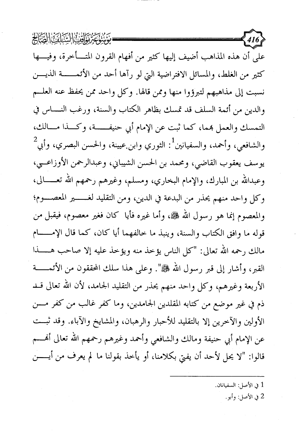 على أن هذه المذاهب أضيف إليها كثير من أفهام القرون المتأخرة، وفيها كثير من الغلط، والمسائل الافتراضية التي لو رآها أحد من الأئمة الذين نسبت إلى مذاهبهم لتبرؤوا منها وممن قالها. وكل واحد ممن يحفظ عنه العلم والدين من أئمة السلف قد تمسك بظاهر الكتاب والسنة، ورغب الناس في التمسك والعمل بهما، كما ثبت عن الإمام أبي حنيفة، وكذا مالك، والشافعي، وأحمد، والسفيانين (¬1): الثوري وابن عيينة، والحسن البصري، وأبي (¬2) يوسف يعقوب القاضي، ومحمد بن الحسن الشيباني، وعبد الرحمن الأوزاعي، وعبد الله بن المبارك، والإمام البخاري، ومسلم، وغيرهم رحمهم الله تعالى، وكل واحد منهم يحذر من البدعة في الدين، ومن التقليد لغير المعصوم؛ والمعصوم إنما هو رسول الله - صلى الله عليه وسلم -، وأما غيره فأياً كان فغير معصوم، فيقبل من قوله ما وافق الكتاب والسنة، وينبذ ما خالفهما أيا كان، كما قال الإمام مالك رحمه الله تعالى: "كل الناس يؤخذ منه ويؤخذ عليه إلا صاحب هذا القبر، وأشار إلى قبر رسول الله - صلى الله عليه وسلم - ".