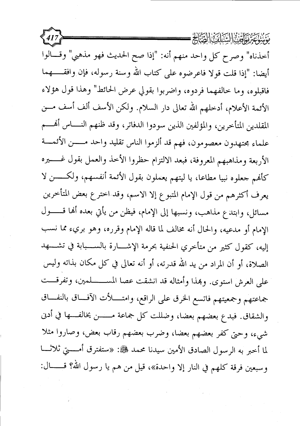 أخذناه" وصرح كل واحد منهم أنه: "إذا صح الحديث فهو مذهبي" وقالوا أيضا: "إذا قلت قولا فاعرضوه على كتاب الله وسنة رسوله، فإن وافقهما فاقبلوه، وما خالفهما فردوه، واضربوا بقولي عرض الحائط" وهذا قول هؤلاء الأئمة الأعلام، أدخلهم الله تعالى دار السلام. ولكن الأسف ألف أسف من المقلدين المتأخرين، والمؤلفين الذين سودوا الدفاتر، وقد ظنهم الناس أنهم علماء مجتهدون معصومون، فهم قد ألزموا الناس تقليد واحد من الأئمة الأربعة ومذاهبهم المعروفة، فبعد الالتزام حظروا الأخذ والعمل بقول غيره كأنهم جعلوه نبيا مطاعا، يا ليتهم يعملون بقول الأئمة أنفسهم، ولكن لا يعرف أكثرهم من قول الإمام المتبوع إلا الاسم، وقد اخترع بعض المتأخرين مسائل، وابتدع مذاهب، ونسبها إلى الإمام، فيظن من يأتي بعده أنها قول الإمام أو مدعيه، والحال أنه مخالف لما قاله الإمام وقرره، وهو بريء مما نسب إليه، كقول كثير من متأخري الحنفية بحرمة الإشارة بالسبابة في تشهد الصلاة، أو أن المراد من يد الله قدرته، أو أنه تعالى في كل مكان بذاته وليس على العرش استوى. وبهذا وأمثاله قد انشقت عصا المسلمين، وتفرقت جماعتهم وجمعيتهم فاتسع الخرق على الراقع، وامتلأت الآفاق بالنفاق والشقاق.