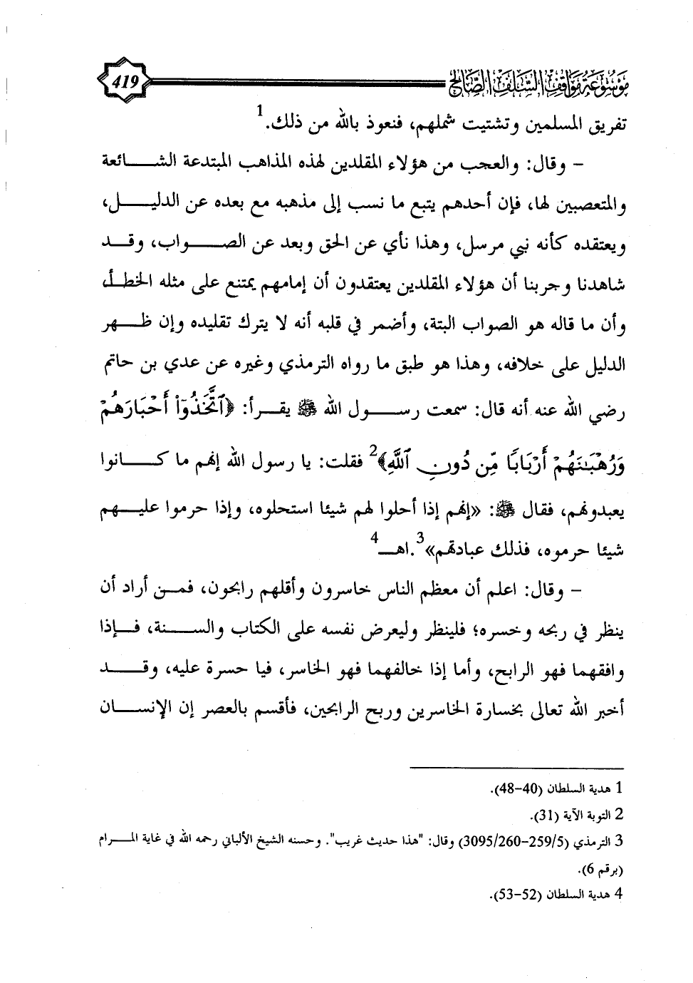 - وقال: والعجب من هؤلاء المقلدين لهذه المذاهب المبتدعة الشائعة والمتعصبين لها، فإن أحدهم يتبع ما نسب إلى مذهبه مع بعده عن الدليل، ويعتقده كأنه نبي مرسل، وهذا نأي عن الحق وبعد عن الصواب، وقد شاهدنا وجربنا أن هؤلاء المقلدين يعتقدون أن إمامهم يمتنع على مثله الخطأ، وأن ما قاله هو الصواب البتة، وأضمر في قلبه أنه لا يترك تقليده وإن ظهر الدليل على خلافه، وهذا هو طبق ما رواه الترمذي وغيره عن عدي بن حاتم رضي الله عنه أنه قال: سمعت رسول الله - صلى الله عليه وسلم - يقرأ: {اتَّخَذُوا أَحْبَارَهُمْ وَرُهْبَانَهُمْ أَرْبَابًا مِنْ دُونِ اللَّهِ} (¬2) فقلت: يا رسول الله إنهم ما كانوا يعبدونهم، فقال - صلى الله عليه وسلم -: «إنهم إذا أحلوا لهم شيئا استحلوه، وإذا حرموا عليهم شيئا حرموه، فذلك عبادتهم» (¬3).اهـ (¬4)