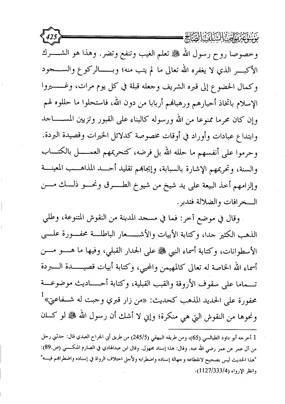 وقال في موضع آخر: فما في مسجد المدينة من النقوش المتنوعة، وطلي الذهب الكثير جدا، وكتابة الأبيات والأشعار الباطلة محفورة على الأسطوانات، وكتابة أسماء النبي - صلى الله عليه وسلم - على الجدار القبلي، وفيها ما هو من أسماء الله الخاصة له تعالى كالمهيمن والمحيي، وكتابة أبيات قصيدة البردة تماما على سقوف الأروقة والقبب القبلية، وكتابة أحاديث موضوعة محفورة على الحديد المذهب كحديث: «من زار قبري وجبت له شفاعتي» (¬1) ونحوها من النقوش التي هي منكرة؛ وإني لا أشك أن رسول الله - صلى الله عليه وسلم - لو كان