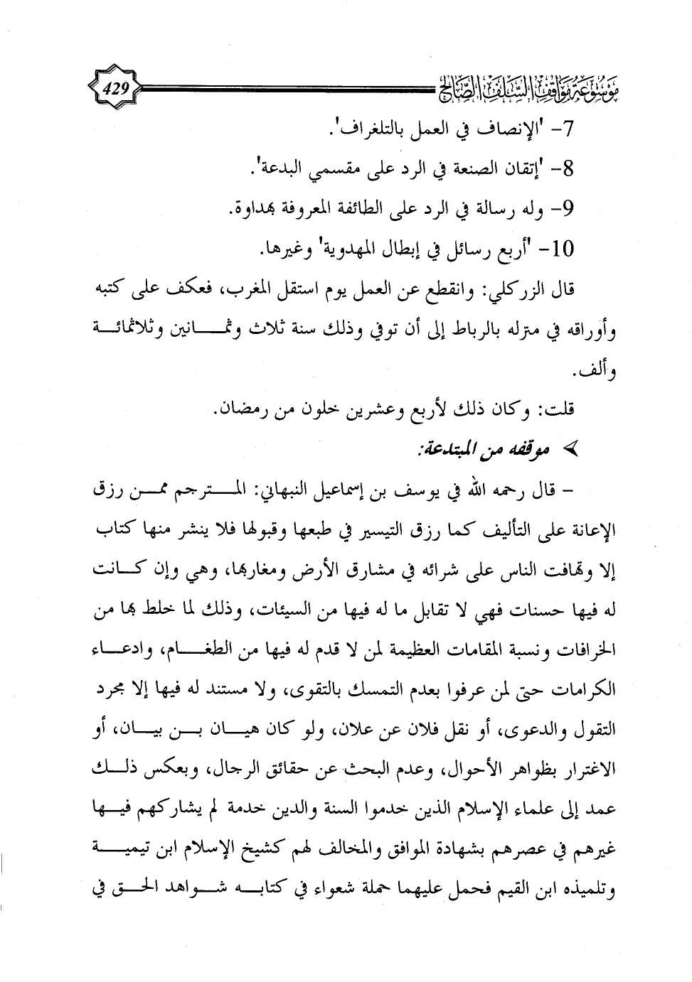- قال رحمه الله في يوسف بن إسماعيل النبهاني: المترجم ممن رزق الإعانة على التأليف كما رزق التيسير في طبعها وقبولها فلا ينشر منها كتاب إلا وتهافت الناس على شرائه في مشارق الأرض ومغاربها، وهي وإن كانت له فيها حسنات فهي لا تقابل ما له فيها من السيئات، وذلك لما خلط بها من الخرافات ونسبة المقامات العظيمة لمن لا قدم له فيها من الطغام، وادعاء الكرامات حتى لمن عرفوا بعدم التمسك بالتقوى، ولا مستند له فيها إلا مجرد التقول والدعوى، أو نقل فلان عن علان، ولو كان هيان بن بيان، أو الاغترار بظواهر الأحوال، وعدم البحث عن حقائق الرجال، وبعكس ذلك عمد إلى علماء الإسلام الذين خدموا السنة والدين خدمة لم يشاركهم فيها غيرهم في عصرهم بشهادة الموافق والمخالف لهم كشيخ الإسلام ابن تيمية وتلميذه ابن القيم فحمل عليهما حملة شعواء في كتابه شواهد الحق في