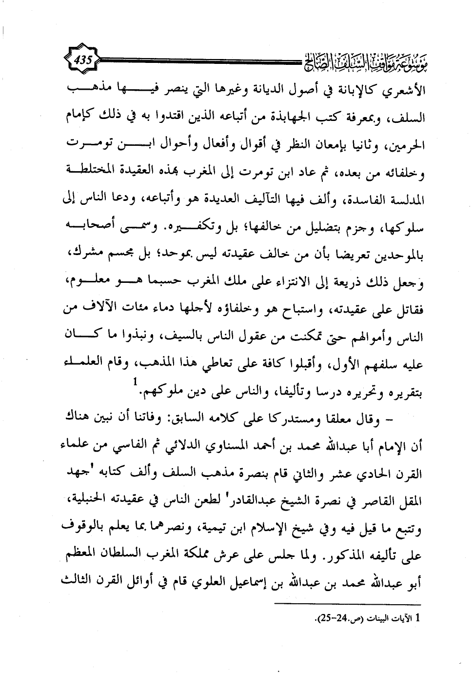 الأشعري كالإبانة في أصول الديانة وغيرها التي ينصر فيها مذهب السلف، وبمعرفة كتب الجهابذة من أتباعه الذين اقتدوا به في ذلك كإمام الحرمين، وثانيا بإمعان النظر في أقوال وأفعال وأحوال ابن تومرت وخلفائه من بعده، ثم عاد ابن تومرت إلى المغرب بهذه العقيدة المختلطة المدلسة الفاسدة، وألف فيها التآليف العديدة هو وأتباعه، ودعا الناس إلى سلوكها، وجزم بتضليل من خالفها؛ بل وتكفيره. وسمى أصحابه بالموحدين تعريضا بأن من خالف عقيدته ليس بموحد؛ بل مجسم مشرك، وجعل ذلك ذريعة إلى الانتزاء على ملك المغرب حسبما هو معلوم، فقاتل على عقيدته، واستباح هو وخلفاؤه لأجلها دماء مئات الآلاف من الناس وأموالهم حتى تمكنت من عقول الناس بالسيف، ونبذوا ما كان عليه سلفهم الأول، وأقبلوا كافة على تعاطي هذا المذهب، وقام العلماء بتقريره وتحريره درسا وتأليفا، والناس على دين ملوكهم. (¬1)