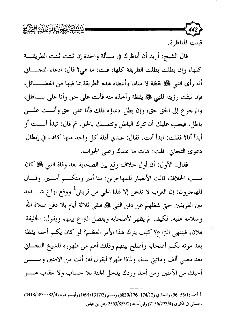 قال الشيخ: أريد أن أناظرك في مسألة واحدة إن ثبتت ثبتت الطريقة كلها، وإن بطلت بطلت الطريقة كلها، قلت: ما هي؟ قال: ادعاء التجاني أنه رأى النبي - صلى الله عليه وسلم - يقظة لا مناما وأعطاه هذه الطريقة بما فيها من الفضائل، فإن ثبتت رؤيته للنبي - صلى الله عليه وسلم - يقظة وأخذه منه فأنت على حق وأنا على باطل، والرجوع إلى الحق حق، وإن بطل ادعاؤه ذلك فأنا على حق وأنت على باطل، فيجب عليك أن تترك الباطل وتتمسك بالحق. ثم قال: تبدأ أنت أو أبدأ أنا؟ فقلت: ابدأ أنت. فقال: عندي أدلة كل واحد منها كاف في إبطال دعوى التجاني. قلت: هات ما عندك وعلي الجواب.