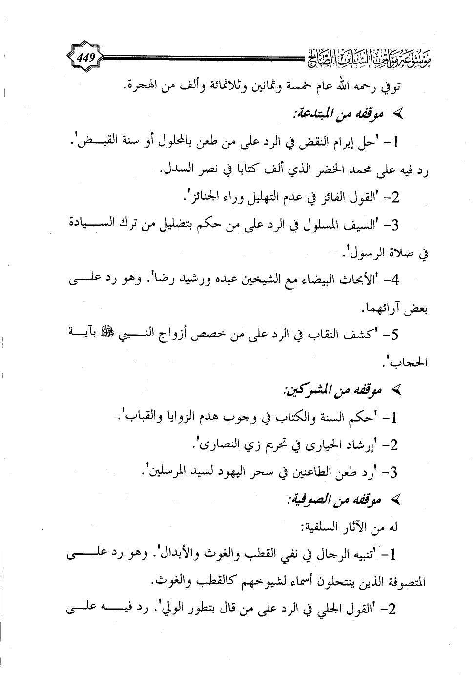 1 - 'تنبيه الرجال في نفي القطب والغوث والأبدال'. وهو رد على المتصوفة الذين ينتحلون أسماء لشيوخهم كالقطب والغوث.