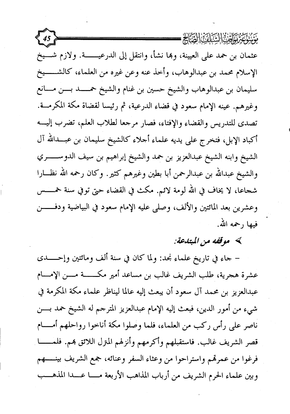 - جاء في تاريخ علماء نجد: ولما كان في سنة ألف ومائتين وإحدى عشرة هجرية، طلب الشريف غالب بن مساعد أمير مكة من الإمام عبد العزيز بن محمد آل سعود أن يبعث إليه عالما ليناظر علماء مكة المكرمة في شيء من أمور الدين، فبعث إليه الإمام عبد العزيز المترجم له الشيخ حمد بن ناصر على رأس ركب من العلماء، فلما وصلوا مكة أناخوا رواحلهم أمام قصر الشريف غالب. فاستقبلهم وأكرمهم وأنزلهم المنزل اللائق بهم. فلما فرغوا من عمرتهم واستراحوا من وعثاء السفر وعنائه، جمع الشريف بينهم وبين علماء الحرم الشريف من أرباب المذاهب الأربعة ما عدا المذهب