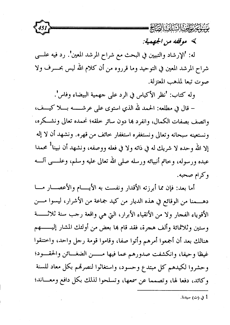 أما بعد: فإن مما أبرزته الأقدار ونفست به الأيام والأعصار ما دهمنا من الوقائع في هذه الديار من كيد جماعة من الأشرار، ليسوا من الأقوياء الفجار ولا من الأتقياء الأبرار، التي هي واقعة رجب سنة ثلاثة وستين وثلاثمائة وألف هجرة، فقد قام بها بعض من أولئك المشار إليهم هنالك بعد أن أجمعوا أمرهم وأتوا صفا، وقاموا قومة رجل واحد، واختنقوا غيظا وحيفا، وانكشفت صدورهم عما فيها من الضغائن والحقود؛ وحشروا لكيدهم كل مبتدع وحسود، واستغاثوا لنصرتهم بكل معاد للسنة وكائد، دفعا لها، وتصمما عن سمعها، وتسلحوا لذلك بكل دافع ومعاند؛