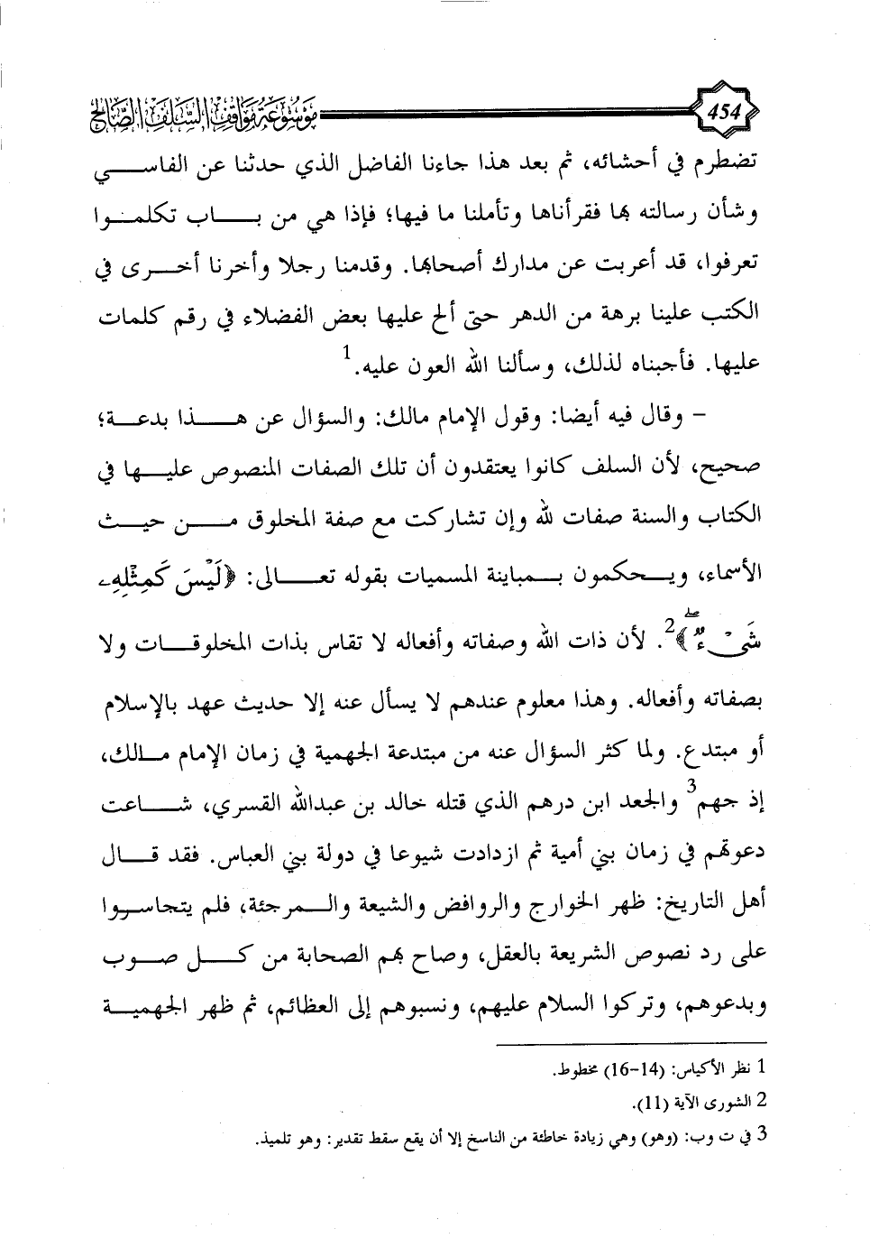 - وقال فيه أيضا: وقول الإمام مالك: والسؤال عن هذا بدعة؛ صحيح، لأن السلف كانوا يعتقدون أن تلك الصفات المنصوص عليها في الكتاب والسنة صفات لله وإن تشاركت مع صفة المخلوق من حيث الأسماء، ويحكمون بمباينة المسميات بقوله تعالى: {لَيْسَ كَمِثْلِهِ شَيْءٌ} (¬2). لأن ذات الله وصفاته وأفعاله لا تقاس بذات المخلوقات ولا بصفاته وأفعاله. وهذا معلوم عندهم لا يسأل عنه إلا حديث عهد بالإسلام أو مبتدع. ولما كثر السؤال عنه من مبتدعة الجهمية في زمان الإمام مالك، إذ جهم (¬3) والجعد ابن درهم الذي قتله خالد بن عبد الله القسري، شاعت دعوتهم في زمان بني أمية ثم ازدادت شيوعا في دولة بني العباس. فقد قال أهل التاريخ: ظهر الخوارج والروافض والشيعة والمرجئة، فلم يتجاسروا على رد نصوص الشريعة بالعقل، وصاح بهم الصحابة من كل صوب وبدّعوهم، وتركوا السلام عليهم، ونسبوهم إلى العظائم، ثم ظهر الجهمية