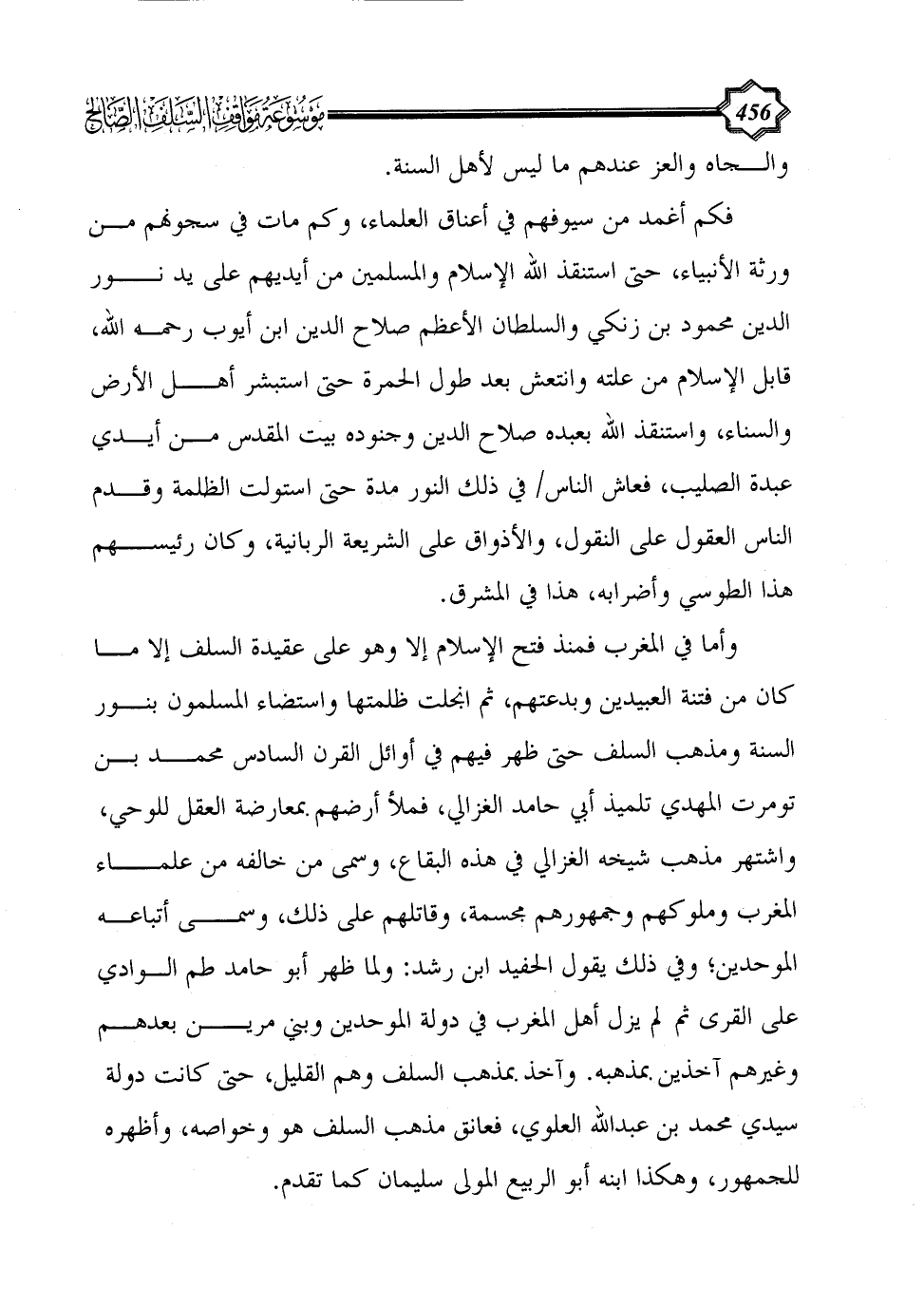 وأما في المغرب فمنذ فتح الإسلام إلا وهو على عقيدة السلف إلا ما كان من فتنة العبيدين وبدعتهم، ثم انجلت ظلمتها واستضاء المسلمون بنور السنة ومذهب السلف حتى ظهر فيهم في أوائل القرن السادس محمد بن تومرت المهدي تلميذ أبي حامد الغزالي، فملأ أرضهم بمعارضة العقل للوحي، واشتهر مذهب شيخه الغزالي في هذه البقاع، وسمى من خالفه من علماء المغرب وملوكهم وجمهورهم مجسمة، وقاتلهم على ذلك، وسمى أتباعه الموحدين؛ وفي ذلك يقول الحفيد ابن رشد: ولما ظهر أبو حامد طم الوادي على القرى ثم لم يزل أهل المغرب في دولة الموحدين وبني مرين بعدهم وغيرهم آخذين بمذهبه. وآخذ بمذهب السلف وهم القليل، حتى كانت دولة سيدي محمد بن عبد الله العلوي، فعانق مذهب السلف هو وخواصه، وأظهره للجمهور، وهكذا ابنه أبو الربيع المولى سليمان كما تقدم.