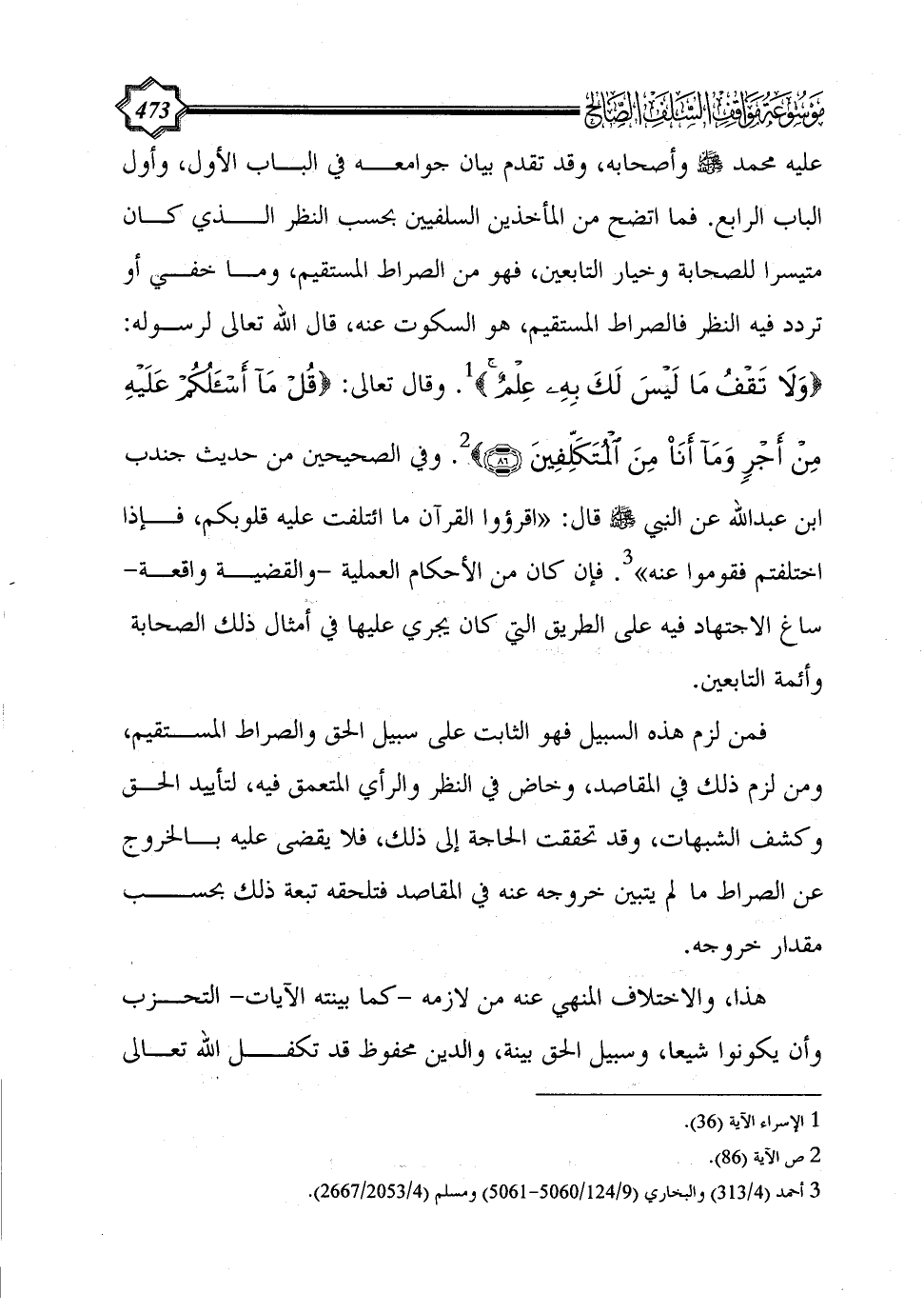 عليه محمد - صلى الله عليه وسلم - وأصحابه، وقد تقدم بيان جوامعه في الباب الأول، وأول الباب الرابع. فما اتضح من المأخذين السلفيين بحسب النظر الذي كان متيسرا للصحابة وخيار التابعين، فهو من الصراط المستقيم، وما خفي أو تردد فيه النظر فالصراط المستقيم، هو السكوت عنه، قال الله تعالى لرسوله: {وَلَا تَقْفُ مَا لَيْسَ لَكَ بِهِ عِلْمٌ} (¬1). وقال تعالى: {قُلْ مَا أَسْأَلُكُمْ عَلَيْهِ مِنْ أَجْرٍ وَمَا أَنَا مِنَ الْمُتَكَلِّفِينَ (86)} (¬2). وفي الصحيحين من حديث جندب ابن عبد الله عن النبي - صلى الله عليه وسلم - قال: «اقرؤوا القرآن ما ائتلفت عليه قلوبكم، فإذا اختلفتم فقوموا عنه» (¬3). فإن كان من الأحكام العملية -والقضية واقعة- ساغ الاجتهاد فيه على الطريق التي كان يجري عليها في أمثال ذلك الصحابة وأئمة التابعين.