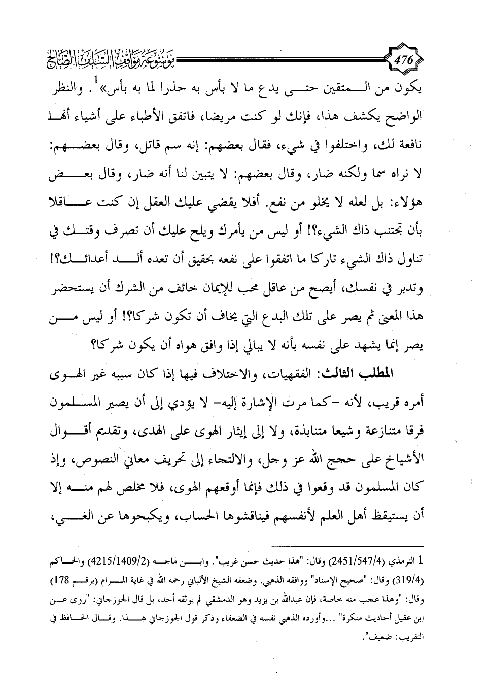 المطلب الثالث: الفقهيات، والاختلاف فيها إذا كان سببه غير الهوى أمره قريب، لأنه -كما مرت الإشارة إليه- لا يؤدي إلى أن يصير المسلمون فرقا متنازعة وشيعا متنابذة، ولا إلى إيثار الهوى على الهدى، وتقديم أقوال الأشياخ على حجج الله عز وجل، والالتجاء إلى تحريف معاني النصوص، وإذ كان المسلمون قد وقعوا في ذلك فإنما أوقعهم الهوى، فلا مخلص لهم منه إلا أن يستيقظ أهل العلم لأنفسهم فيناقشوها الحساب، ويكبحوها عن الغي،