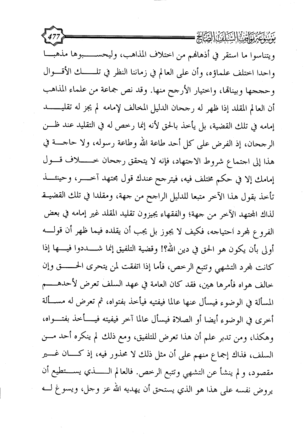 وقد نص جماعة من علماء المذاهب أن العالم المقلد إذا ظهر له رجحان الدليل المخالف لإمامه لم يجز له تقليد إمامه في تلك القضية، بل يأخذ بالحق لأنه إنما رخص له في التقليد عند ظن الرجحان، إذ الفرض على كل أحد طاعة الله وطاعة رسوله، ولا حاجة في هذا إلى اجتماع شروط الاجتهاد، فإنه لا يتحقق رجحان خلاف قول إمامك إلا في حكم مختلف فيه، فيترجح عندك قول مجتهد آخر، وحينئذ تأخذ بقول هذا الآخر متبعا للدليل الراجح من جهة، ومقلدا في تلك القضية لذاك المجتهد الآخر من جهة؛ والفقهاء يجيزون تقليد المقلد غير إمامه في بعض الفروع لمجرد احتياجه، فكيف لا يجوز بل يجب أن يقلده فيما ظهر أن قوله أولى بأن يكون هو الحق في دين الله؟! وقضية التلفيق إنما شددوا فيها إذا كانت لمجرد التشهي وتتبع الرخص، فأما إذا اتفقت لمن يتحرى الحق وإن خالف هواه فأمرها هين، فقد كان العامة في عهد السلف تعرض لأحدهم المسألة في الوضوء فيسأل عنها عالما فيفتيه فيأخذ بفتواه، ثم تعرض له مسألة أخرى في الوضوء أيضا أو الصلاة فيسأل عالما آخر فيفيته فيأخذ بفتواه، وهكذا، ومن تدبر علم أن هذا تعرض للتلفيق، ومع ذلك لم ينكره أحد من السلف، فذاك إجماع منهم على أن مثل ذلك لا محذور فيه، إذ كان غير مقصود، ولم ينشأ عن التشهي وتتبع الرخص. فالعالم الذي يستطيع أن يروض نفسه على هذا هو الذي يستحق أن يهديه الله عز وجل، ويسوغ له