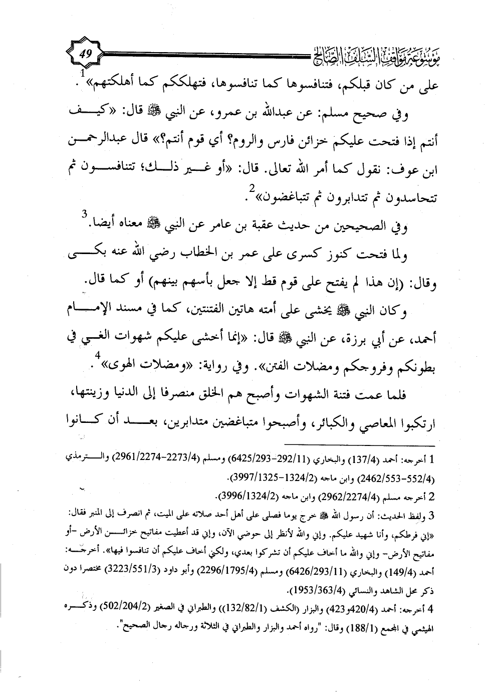 (¬3) ولفظ الحديث: أن رسول الله - صلى الله عليه وسلم - خرج يوما فصلى على أهل أحد صلاته على الميت، ثم انصرف إلى المنبر فقال: «إني فرطكم، وأنا شهيد عليكم. وإني والله لأنظر إلى حوضي الآن، وإني قد أعطيت مفاتيح خزائن الأرض -أو مفاتيح الأرض- وإني والله ما أخاف عليكم أن تشركوا بعدي، ولكني أخاف عليكم أن تنافسوا فيها». أخرجه: أحمد (4/ 149) والبخاري (11/ 293/6426) ومسلم (4/ 1795/2296) وأبو داود (3/ 551/3223) مختصرا دون ذكر محل الشاهد والنسائي (4/ 363/1953).