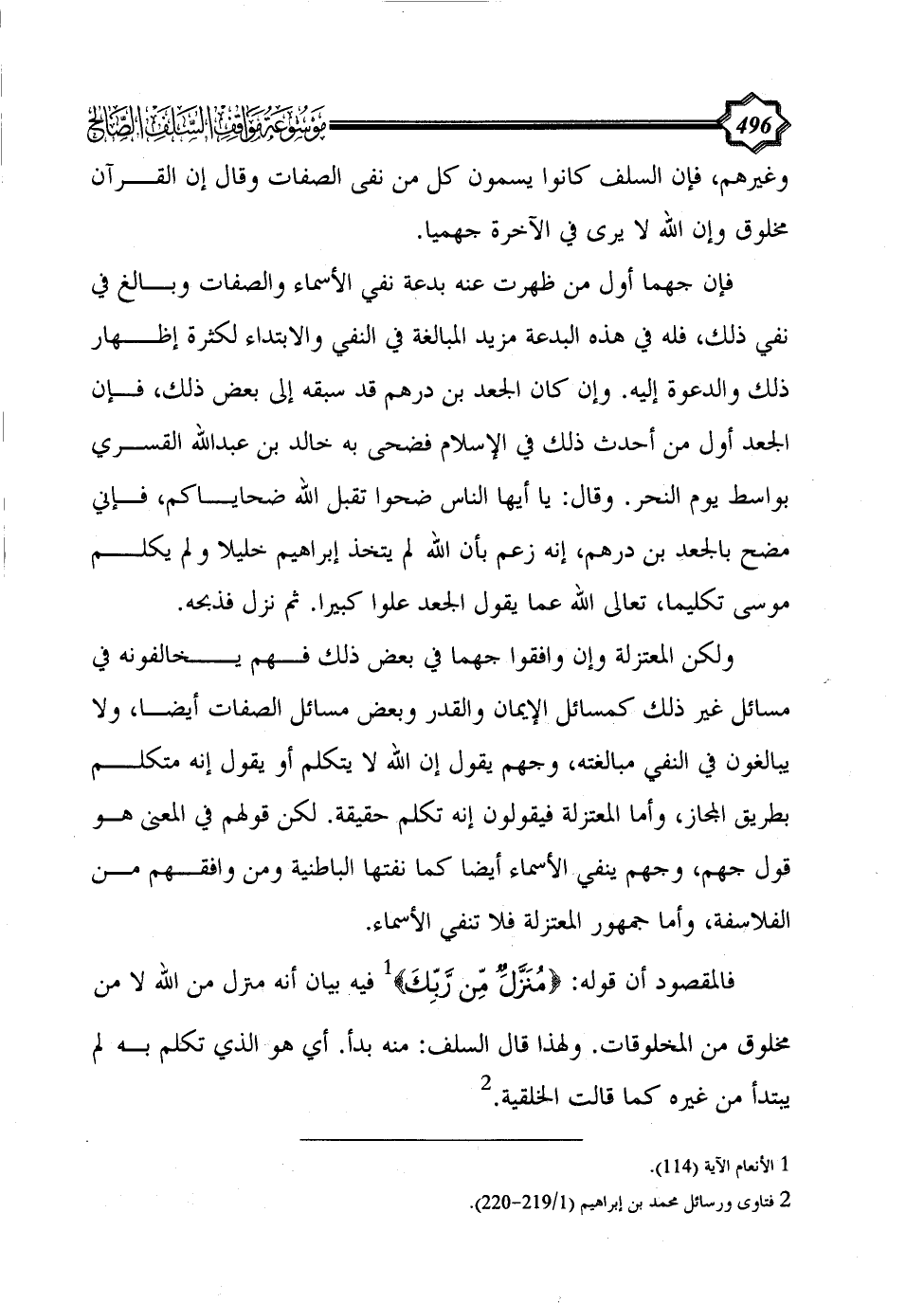 فإن جهما أول من ظهرت عنه بدعة نفي الأسماء والصفات وبالغ في نفي ذلك، فله في هذه البدعة مزيد المبالغة في النفي والابتداء لكثرة إظهار ذلك والدعوة إليه. وإن كان الجعد بن درهم قد سبقه إلى بعض ذلك، فإن الجعد أول من أحدث ذلك في الإسلام فضحى به خالد بن عبد الله القسري بواسط يوم النحر. وقال: يا أيها الناس ضحوا تقبل الله ضحاياكم، فإني مضح بالجعد بن درهم، إنه زعم بأن الله لم يتخذ إبراهيم خليلا ولم يكلم موسى تكليما، تعالى الله عما يقول الجعد علوا كبيرا. ثم نزل فذبحه.
