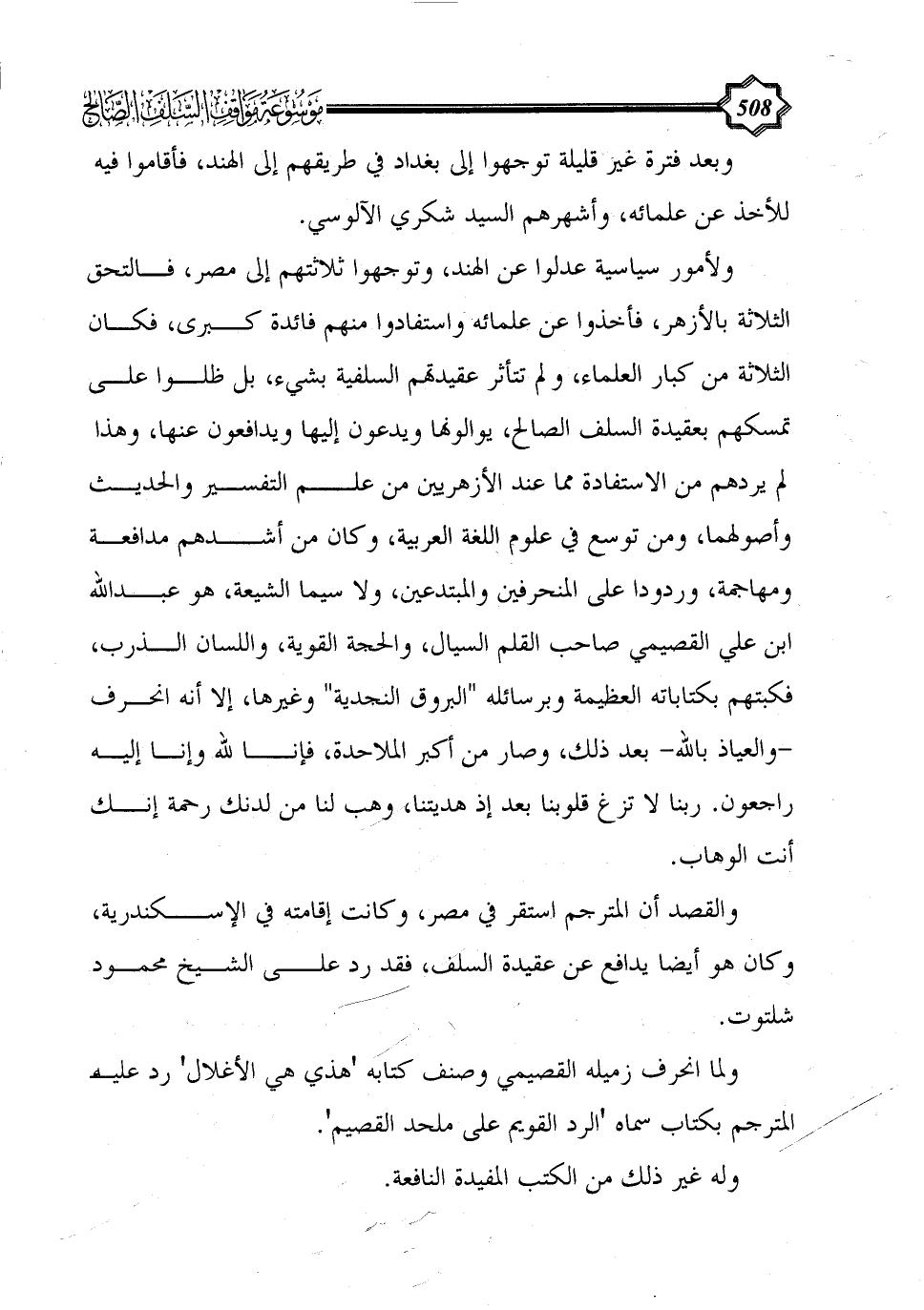 ولأمور سياسية عدلوا عن الهند، وتوجهوا ثلاثتهم إلى مصر، فالتحق الثلاثة بالأزهر، فأخذوا عن علمائه واستفادوا منهم فائدة كبرى، فكان الثلاثة من كبار العلماء، ولم تتأثر عقيدتهم السلفية بشيء، بل ظلوا على تمسكهم بعقيدة السلف الصالح، يوالونها ويدعون إليها ويدافعون عنها، وهذا لم يردهم من الاستفادة مما عند الأزهريين من علم التفسير والحديث وأصولهما، ومن توسع في علوم اللغة العربية، وكان من أشدهم مدافعة ومهاجمة، وردوداً على المنحرفين والمبتدعين، ولا سيما الشيعة، هو عبد الله ابن علي القصيمي صاحب القلم السيال، والحجة القوية، واللسان الذرب، فكبتهم بكتاباته العظيمة وبرسائله "البروق النجدية" وغيرها، إلا أنه انحرف -والعياذ بالله- بعد ذلك، وصار من أكبر الملاحدة، فإنا لله وإنا إليه راجعون. ربنا لا تزغ قلوبنا بعد إذ هديتنا، وهب لنا من لدنك رحمة إنك أنت الوهاب.