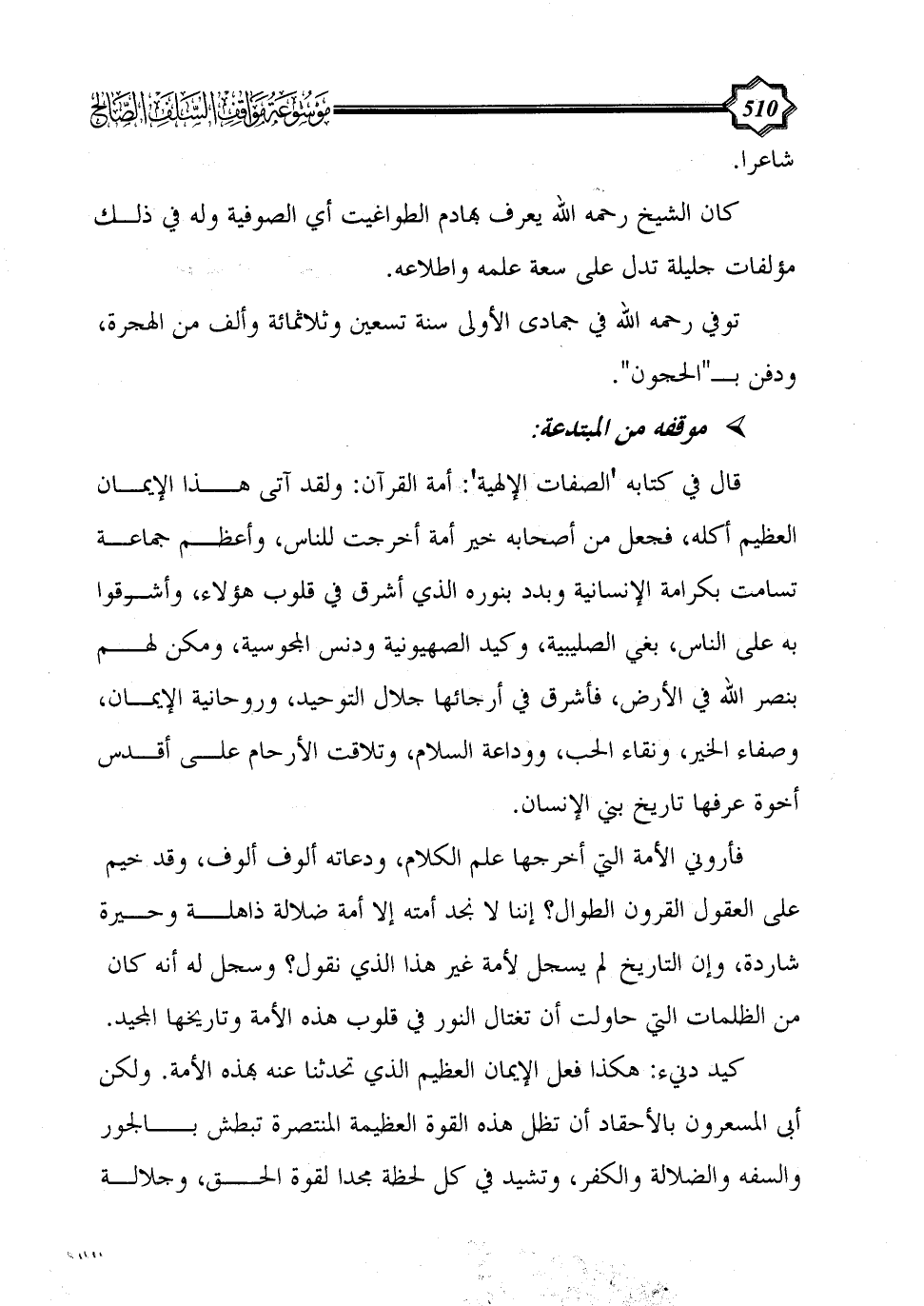 قال في كتابه 'الصفات الإلهية': أمة القرآن: ولقد آتى هذا الإيمان العظيم أكله، فجعل من أصحابه خير أمة أخرجت للناس، وأعظم جماعة تسامت بكرامة الإنسانية وبدد بنوره الذي أشرق في قلوب هؤلاء، وأشرقوا به على الناس، بغي الصليبية، وكيد الصهيونية ودنس المجوسية، ومكن لهم بنصر الله في الأرض، فأشرق في أرجائها جلال التوحيد، وروحانية الإيمان، وصفاء الخير، ونقاء الحب، ووداعة السلام، وتلاقت الأرحام على أقدس أخوة عرفها تاريخ بني الإنسان.