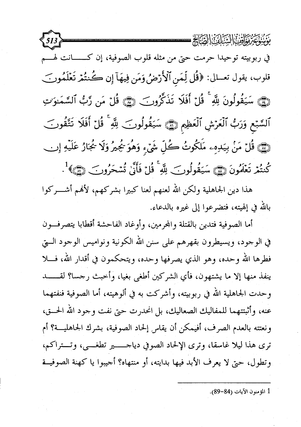 في ربوبيته توحيدا حرمت حتى من مثله قلوب الصوفية، إن كانت لهم قلوب، يقول تعالى: {قُلْ لِمَنِ الْأَرْضُ وَمَنْ فِيهَا إِنْ كُنْتُمْ تَعْلَمُونَ (84) سَيَقُولُونَ لِلَّهِ قُلْ أَفَلَا تَذَكَّرُونَ (85) قُلْ مَنْ رَبُّ السَّمَاوَاتِ السَّبْعِ وَرَبُّ الْعَرْشِ الْعَظِيمِ (86) سَيَقُولُونَ لِلَّهِ قُلْ أَفَلَا تَتَّقُونَ (87) قُلْ مَنْ بِيَدِهِ مَلَكُوتُ كُلِّ شَيْءٍ وَهُوَ يُجِيرُ وَلَا يُجَارُ عَلَيْهِ إِن كُنْتُمْ تَعْلَمُونَ (88) سَيَقُولُونَ لِلَّهِ قُلْ فَأَنَّى تُسْحَرُونَ (89)} (¬1).