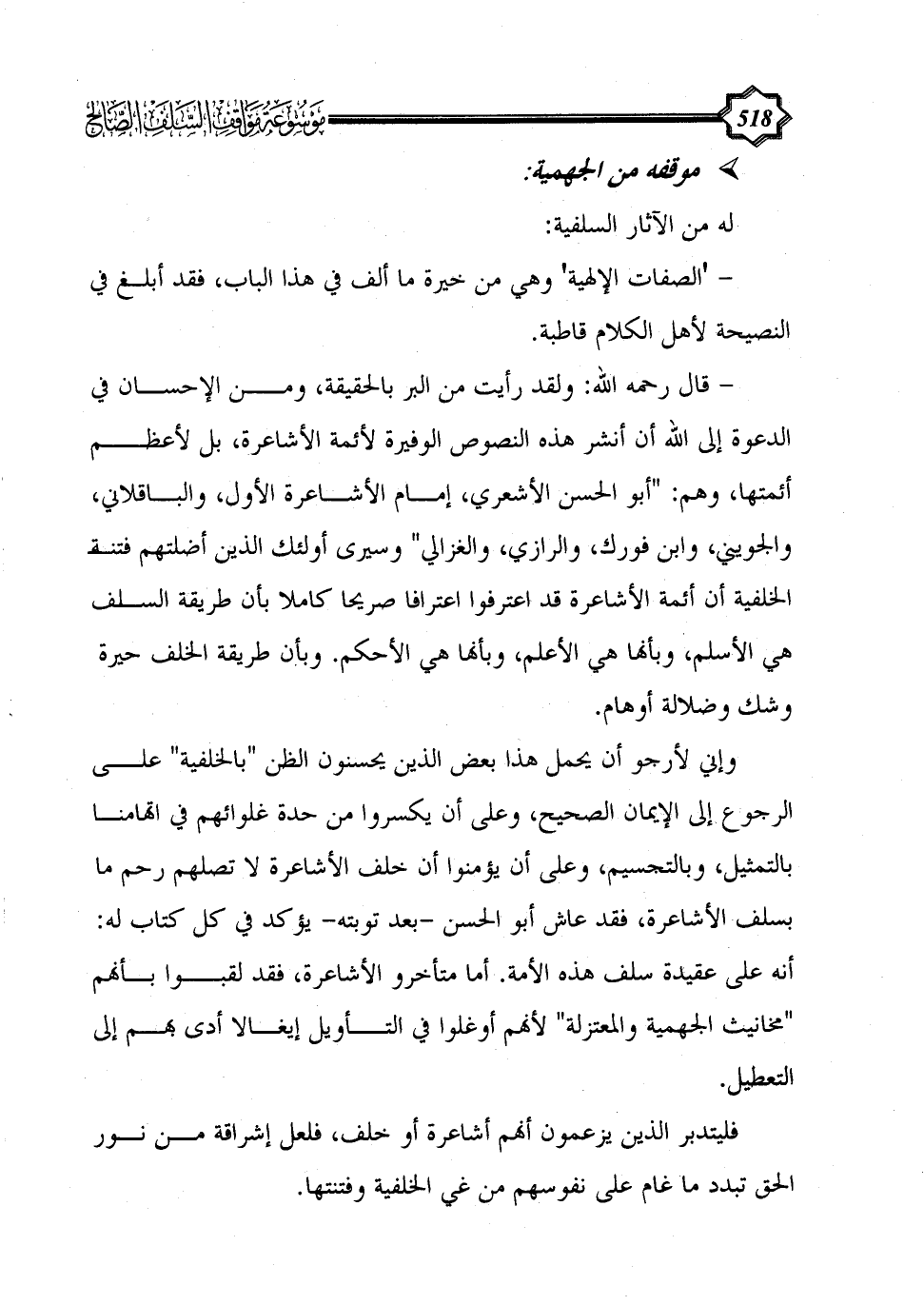 - قال رحمه الله: ولقد رأيت من البر بالحقيقة، ومن الإحسان في الدعوة إلى الله أن أنشر هذه النصوص الوفيرة لأئمة الأشاعرة، بل لأعظم أئمتها، وهم: "أبو الحسن الأشعري، إمام الأشاعرة الأول، والباقلاني، والجُوَيْني، وابن فُورك، والرازي، والغزالي" وسيرى أولئك الذين أضَلتهم فتنةُ الخلفية أن أئمة الأشاعرة قد اعترفوا اعترافاً صريحاً كاملاً بأن طريقة السلف هي الأسلم، وبأنها هي الأعلم، وبأنها هي الأحكم. وبأن طريقة الخلف حيرة وشك وضلالة أوهام.