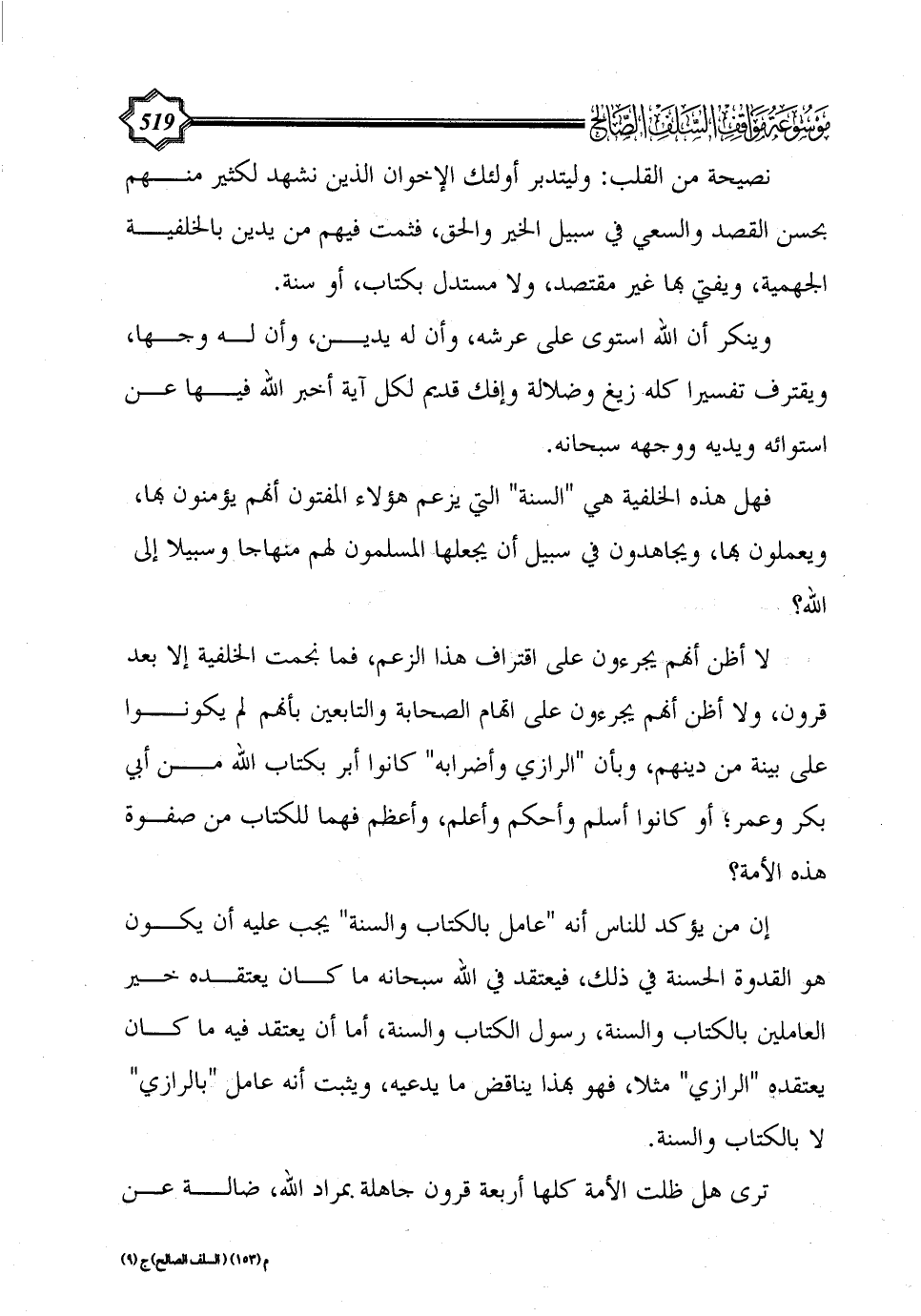 نصيحة من القلب: وليتدبر أولئك الإخوان الذين نشهد لكثير منهم بحسن القصد والسعي في سبيل الخير والحق، فَثَمَّت فيهم من يدين بالخلفية الجهمية، ويفتي بها غير مقتصد، ولا مُسْتَدِل بكتاب، أو سنة.