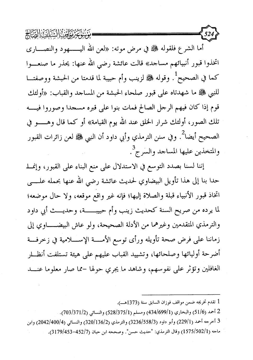 إننا لسنا بصدد التوسع في الاستدلال على منع البناء على القبور، وإنما حدا بنا إلى هذا تأويل البيضاوي لحديث عائشة رضي الله عنها بحمله على اتخاذ قبور الأنبياء قبلة والصلاة إليها؛ فإنه غير واقع موقعه، ولا حال موضعه؛ لما يرده من صريح السنة كحديث زينب وأم حبيبة، وحديث أبي داود والترمذي المتقدمين وغيرهما من الأدلة الصحيحة، ولو عاش البيضاوي إلى زماننا على فرض صحة تأويله ورأى توسع الأمة الإسلامية في زخرفة أضرحة أوليائها وصلحائها، وتشييد القباب عليهم على هيئة تستلفت أنظار الغافلين وتؤثر على نفوسهم، وشاهد ما يجري حولها -مما صار معلوما عند
