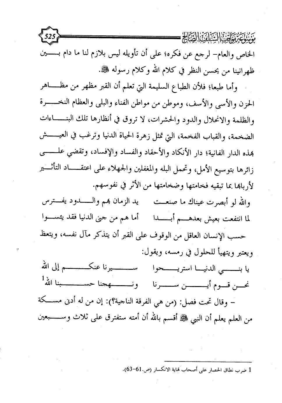 - وقال تحت فصل: (من هي الفرقة الناجية؟): إن من له أدنى مسكة من العلم يعلم أن النبي - صلى الله عليه وسلم - أقسم بالله أن أمته ستفترق على ثلاث وسبعين