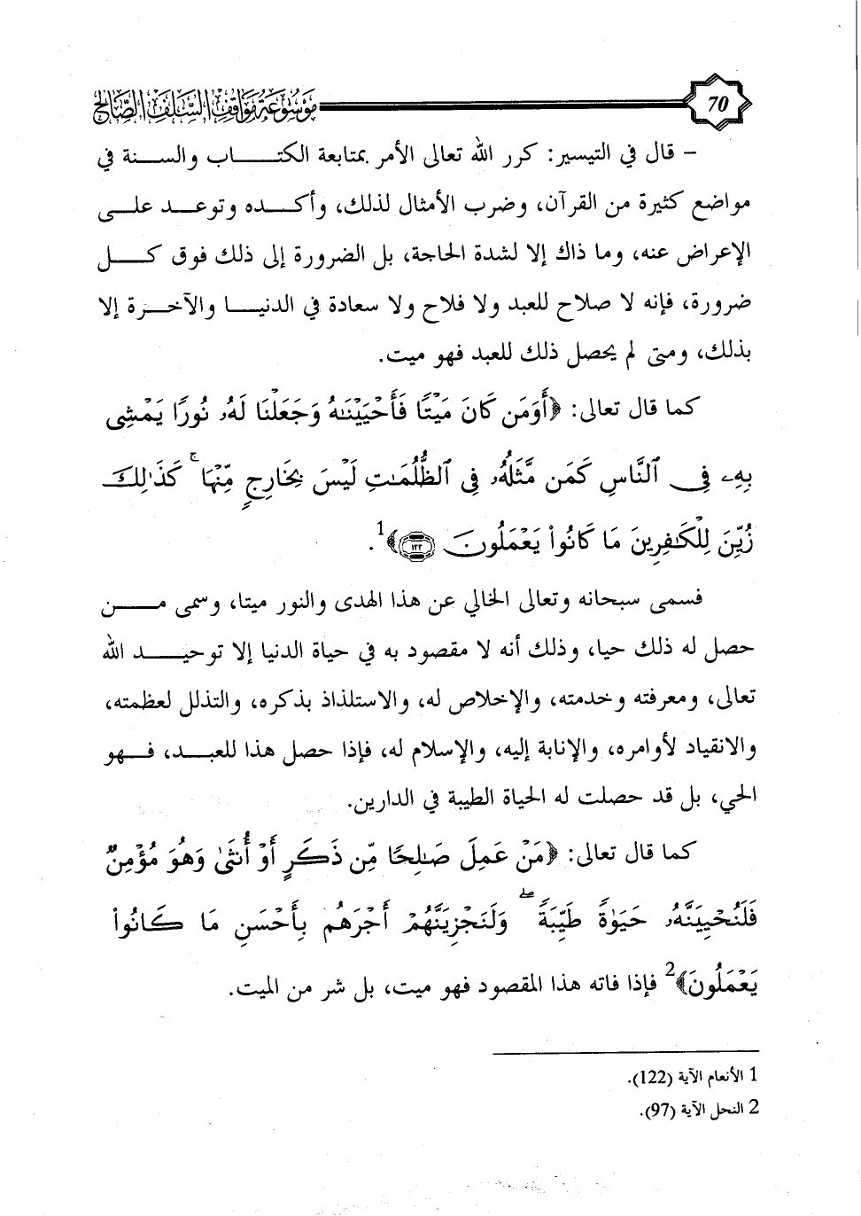 - قال في التيسير: كرر الله تعالى الأمر بمتابعة الكتاب والسنة في مواضع كثيرة من القرآن، وضرب الأمثال لذلك، وأكده وتوعد على الإعراض عنه، وما ذاك إلا لشدة الحاجة، بل الضرورة إلى ذلك فوق كل ضرورة، فإنه لا صلاح للعبد ولا فلاح ولا سعادة في الدنيا والآخرة إلا بذلك، ومتى لم يحصل ذلك للعبد فهو ميت.