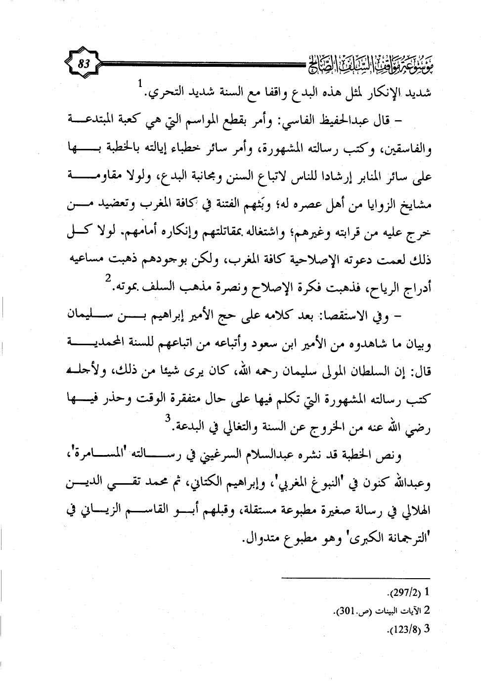 - وفي الاستقصا: بعد كلامه على حج الأمير إبراهيم بن سليمان وبيان ما شاهدوه من الأمير ابن سعود وأتباعه من اتباعهم للسنة المحمدية قال: إن السلطان المولى سليمان رحمه الله، كان يرى شيئا من ذلك، ولأجله كتب رسالته المشهورة التي تكلم فيها على حال متفقرة الوقت وحذر فيها رضي الله عنه من الخروج عن السنة والتغالي في البدعة. (¬3)