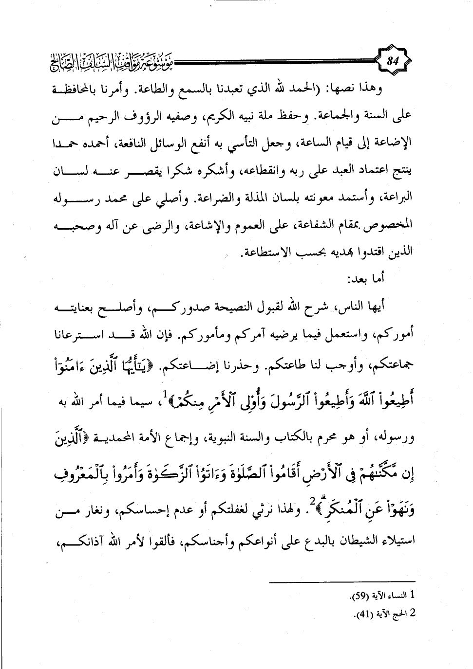 أيها الناس، شرح الله لقبول النصيحة صدوركم، وأصلح بعنايته أموركم، واستعمل فيما يرضيه آمركم ومأموركم. فإن الله قد استرعانا جماعتكم، وأوجب لنا طاعتكم. وحذرنا إضاعتكم. {يَا أَيُّهَا الَّذِينَ آَمَنُوا أَطِيعُوا اللَّهَ وَأَطِيعُوا الرَّسُولَ وَأُولِي الْأَمْرِ مِنْكُمْ} (¬1)، سيما فيما أمر الله به ورسوله، أو هو محرم بالكتاب والسنة النبوية، وإجماع الأمة المحمدية {الَّذِينَ إِنْ مَكَّنَّاهُمْ فِي الْأَرْضِ أَقَامُوا الصَّلَاةَ وَآَتَوُا الزَّكَاةَ وَأَمَرُوا بِالْمَعْرُوفِ وَنَهَوْا عَنِ الْمُنْكَرِ} (¬2). ولهذا نرثي لغفلتكم أو عدم إحساسكم، ونغار من استيلاء الشيطان بالبدع على أنواعكم وأجناسكم، فألقوا لأمر الله آذانكم،