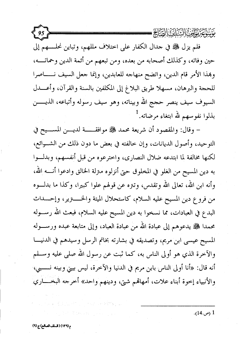 - وقال: والمقصود أن شريعة محمد - صلى الله عليه وسلم - موافقة لدين المسيح في التوحيد، وأصول الديانات، وإن خالفته في بعض ما دون ذلك من الشرائع، لكنها مخالفة لما ابتدعه ضلال النصارى، واخترعوه من قبل أنفسهم، وبدلوا به دين المسيح من الغلو في المخلوق حتى أنزلوه منزلة الخالق وادعوا أنه الله، وأنه ابن الله، تعالى الله وتقدس، وتنزه عن قولهم علوا كبيرا، وكذا ما بدلوه من فروع دين المسيح عليه السلام، كاستحلال الميتة والخنزير، وإحداث البدع في العبادات، مما نسخوا به دين المسيح عليه السلام، فبعث الله رسوله محمدا - صلى الله عليه وسلم - يدعوهم إلى عبادة الله من عبادة العباد، وإلى متابعة عبده ورسوله المسيح عيسى ابن مريم، وتصديقه في بشارته بخاتم الرسل وسيدهم في الدنيا والآخرة الذي هو أولى الناس به، كما ثبت عن رسول الله صلى عليه وسلم أنه قال: «أنا أولى الناس بابن مريم في الدنيا والآخرة، ليس بيني وبينه نبي، والأنبياء إخوة أبناء علات، أمهاتهم شتى، ودينهم واحد» أخرجه البخاري