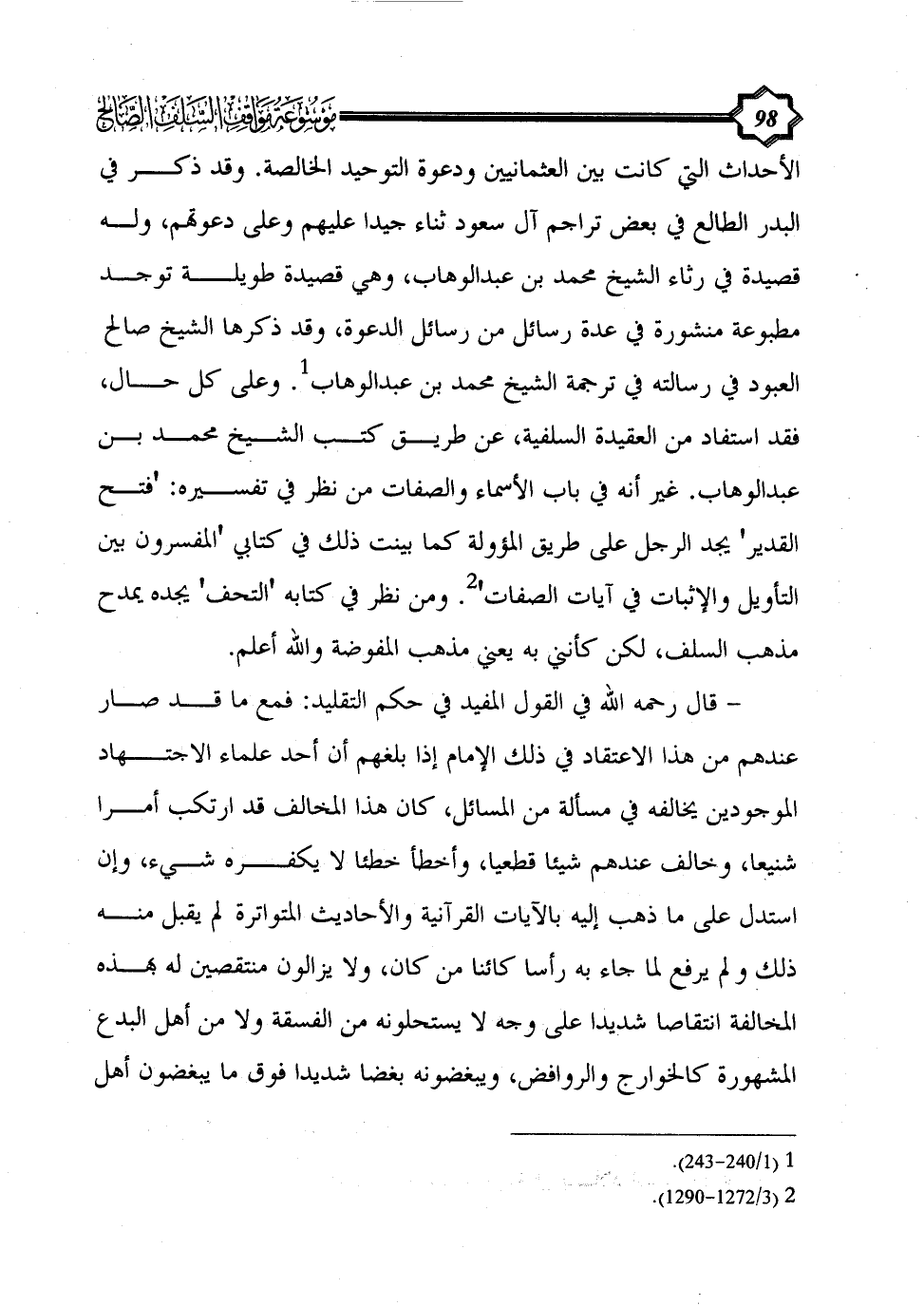 الأحداث التي كانت بين العثمانيين ودعوة التوحيد الخالصة. وقد ذكر في البدر الطالع في بعض تراجم آل سعود ثناء جيدا عليهم وعلى دعوتهم، وله قصيدة في رثاء الشيخ محمد بن عبد الوهاب، وهي قصيدة طويلة توجد مطبوعة منشورة في عدة رسائل من رسائل الدعوة، وقد ذكرها الشيخ صالح العبود في رسالته في ترجمة الشيخ محمد بن عبد الوهاب (¬1). وعلى كل حال، فقد استفاد من العقيدة السلفية، عن طريق كتب الشيخ محمد بن عبد الوهاب. غير أنه في باب الأسماء والصفات من نظر في تفسيره: 'فتح القدير' يجد الرجل على طريق المؤولة كما بينت ذلك في كتابي 'المفسرون بين التأويل والإثبات في آيات الصفات' (¬2). ومن نظر في كتابه 'التحف' يجده يمدح مذهب السلف، لكن كأنني به يعني مذهب المفوضة والله أعلم.