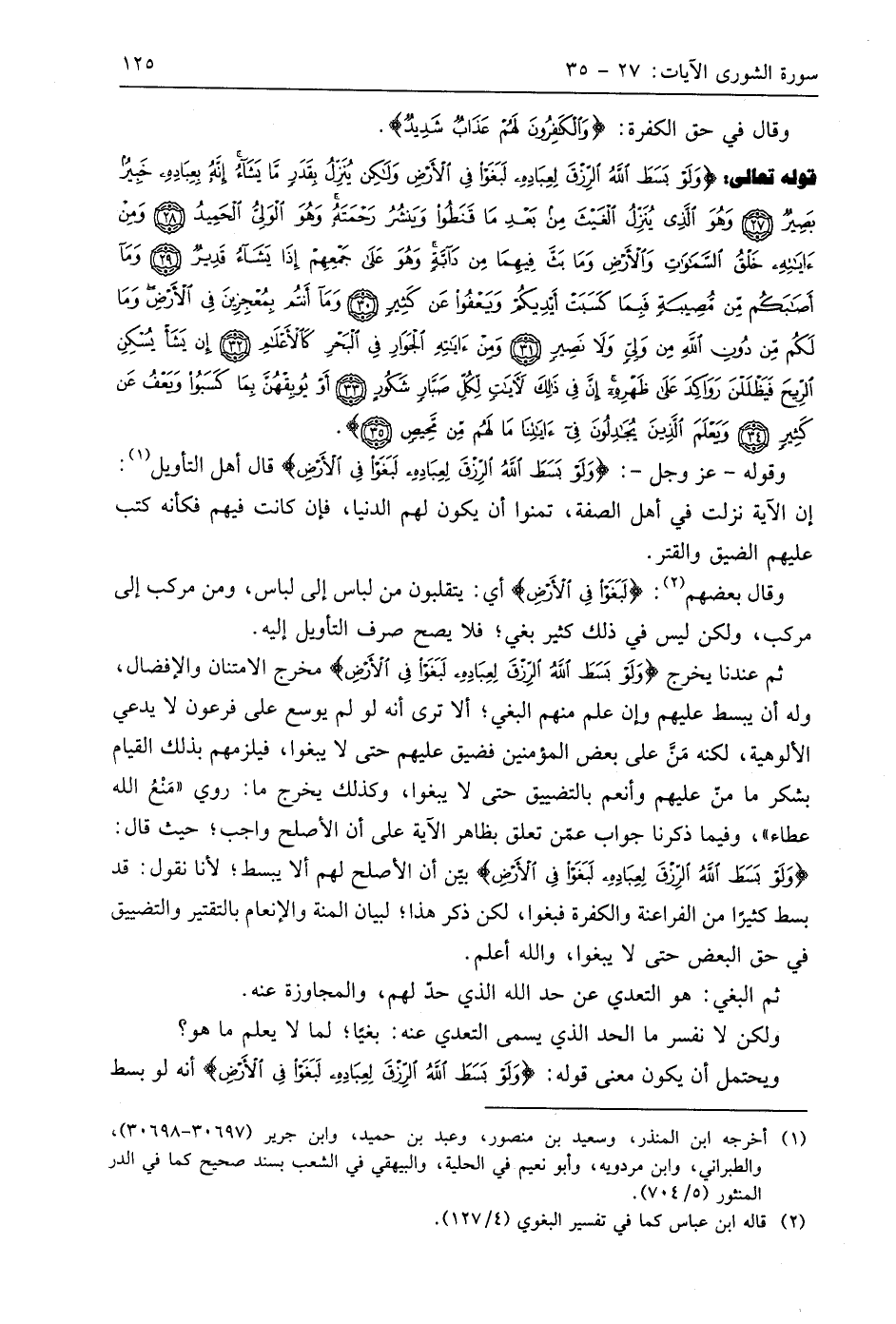 قوله تعالى (وَلَوْ بَسَطَ اللَّهُ الرِّزْقَ لِعِبَادِهِ لَبَغَوْا فِي الْأَرْضِ وَلَكِنْ يُنَزِّلُ بِقَدَرٍ مَا يَشَاءُ إِنَّهُ بِعِبَادِهِ خَبِيرٌ بَصِيرٌ (27) وَهُوَ الَّذِي يُنَزِّلُ الْغَيْثَ مِنْ بَعْدِ مَا قَنَطُوا وَيَنْشُرُ رَحْمَتَهُ وَهُوَ الْوَلِيُّ الْحَمِيدُ (28) وَمِنْ آيَاتِهِ خَلْقُ السَّمَاوَاتِ وَالْأَرْضِ وَمَا بَثَّ فِيهِمَا مِنْ دَابَّةٍ وَهُوَ عَلَى جَمْعِهِمْ إِذَا يَشَاءُ قَدِيرٌ (29) وَمَا أَصَابَكُمْ مِنْ مُصِيبَةٍ فَبِمَا كَسَبَتْ أَيْدِيكُمْ وَيَعْفُو عَنْ كَثِيرٍ (30) وَمَا أَنْتُمْ بِمُعْجِزِينَ فِي الْأَرْضِ وَمَا لَكُمْ مِنْ دُونِ اللَّهِ مِنْ وَلِيٍّ وَلَا نَصِيرٍ (31) وَمِنْ آيَاتِهِ الْجَوَارِ فِي الْبَحْرِ كَالْأَعْلَامِ (32) إِنْ يَشَأْ يُسْكِنِ الرِّيحَ فَيَظْلَلْنَ رَوَاكِدَ عَلَى ظَهْرِهِ إِنَّ فِي ذَلِكَ لَآيَاتٍ لِكُلِّ صَبَّارٍ شَكُورٍ (33) أَوْ يُوبِقْهُنَّ بِمَا كَسَبُوا وَيَعْفُ عَنْ كَثِيرٍ (34) وَيَعْلَمَ الَّذِينَ يُجَادِلُونَ فِي آيَاتِنَا مَا لَهُمْ مِنْ مَحِيصٍ (35)