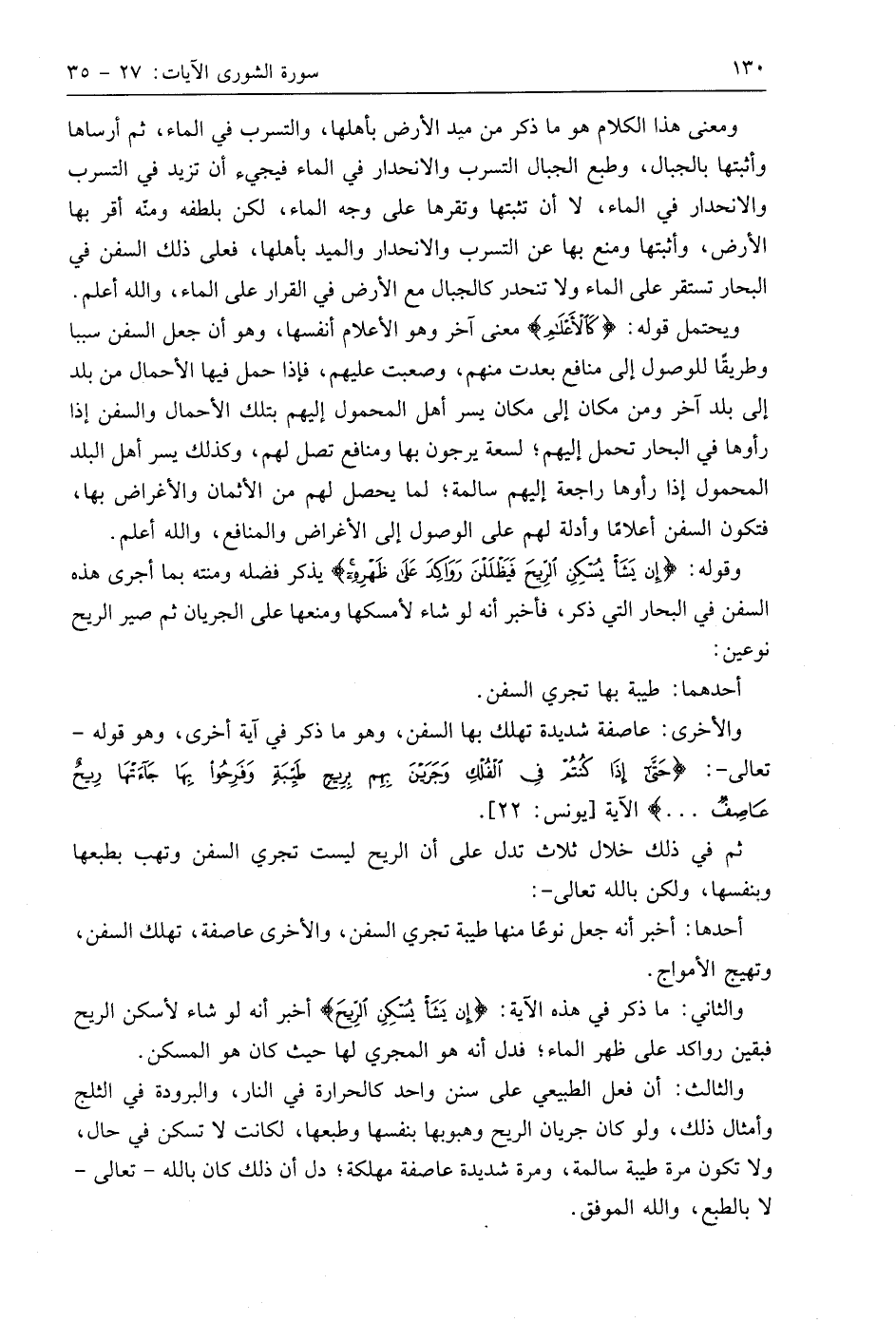 وقوله: (إِنْ يَشَأْ يُسْكِنِ الرِّيحَ فَيَظْلَلْنَ رَوَاكِدَ عَلَى ظَهْرِهِ إِنَّ فِي ذَلِكَ لَآيَاتٍ لِكُلِّ صَبَّارٍ شَكُورٍ (33) يذكر فضله ومنته بما أجرى هذه السفن في البحار التي ذكر، فأخبر أنه لو شاء لأمسكها ومنعها على الجريان ثم صير الريح نوعين: