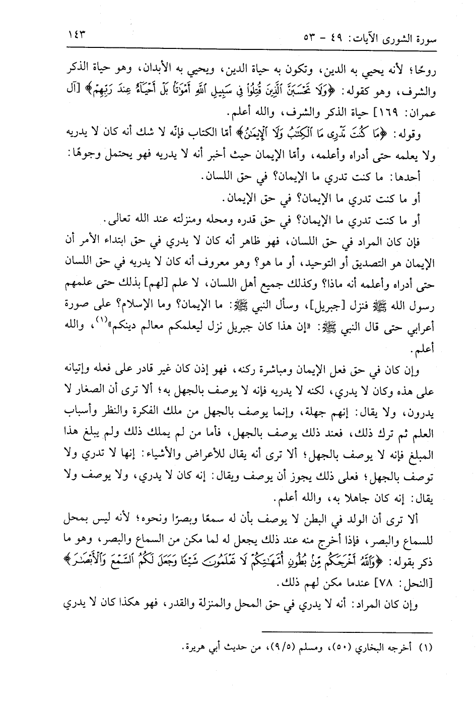 وقوله: (مَا كُنْتَ تَدْرِي مَا الْكِتَابُ وَلَا الْإِيمَانُ) أمَّا الكتاب فإنه لا شك أنه كان لا يدريه ولا يعلمه حتى أدراه وأعلمه، وأمَّا الإيمان حيث أخبر أنه لا يدريه فهو يحتمل وجوهًا: