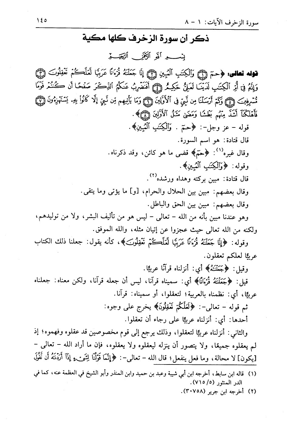 قوله تعالى: (حم (1) وَالْكِتَابِ الْمُبِينِ (2) إِنَّا جَعَلْنَاهُ قُرْآنًا عَرَبِيًّا لَعَلَّكُمْ تَعْقِلُونَ (3) وَإِنَّهُ فِي أُمِّ الْكِتَابِ لَدَيْنَا لَعَلِيٌّ حَكِيمٌ (4) أَفَنَضْرِبُ عَنْكُمُ الذِّكْرَ صَفْحًا أَنْ كُنْتُمْ قَوْمًا مُسْرِفِينَ (5) وَكَمْ أَرْسَلْنَا مِنْ نَبِيٍّ فِي الْأَوَّلِينَ (6) وَمَا يَأْتِيهِمْ مِنْ نَبِيٍّ إِلَّا كَانُوا بِهِ يَسْتَهْزِءُونَ (7) فَأَهْلَكْنَا أَشَدَّ مِنْهُمْ بَطْشًا وَمَضَى مَثَلُ الْأَوَّلِينَ (8)