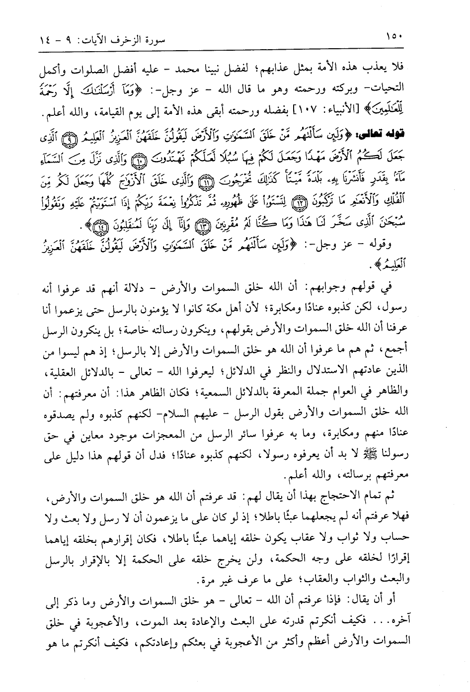قوله تعالى: (وَلَئِنْ سَأَلْتَهُمْ مَنْ خَلَقَ السَّمَاوَاتِ وَالْأَرْضَ لَيَقُولُنَّ خَلَقَهُنَّ الْعَزِيزُ الْعَلِيمُ (9) الَّذِي جَعَلَ لَكُمُ الْأَرْضَ مَهْدًا وَجَعَلَ لَكُمْ فِيهَا سُبُلًا لَعَلَّكُمْ تَهْتَدُونَ (10) وَالَّذِي نَزَّلَ مِنَ السَّمَاءِ مَاءً بِقَدَرٍ فَأَنْشَرْنَا بِهِ بَلْدَةً مَيْتًا كَذَلِكَ تُخْرَجُونَ (11) وَالَّذِي خَلَقَ الْأَزْوَاجَ كُلَّهَا وَجَعَلَ لَكُمْ مِنَ الْفُلْكِ وَالْأَنْعَامِ مَا تَرْكَبُونَ (12) لِتَسْتَوُوا عَلَى ظُهُورِهِ ثُمَّ تَذْكُرُوا نِعْمَةَ رَبِّكُمْ إِذَا اسْتَوَيْتُمْ عَلَيْهِ وَتَقُولُوا سُبْحَانَ الَّذِي سَخَّرَ لَنَا هَذَا وَمَا كُنَّا لَهُ مُقْرِنِينَ (13) وَإِنَّا إِلَى رَبِّنَا لَمُنْقَلِبُونَ (14)