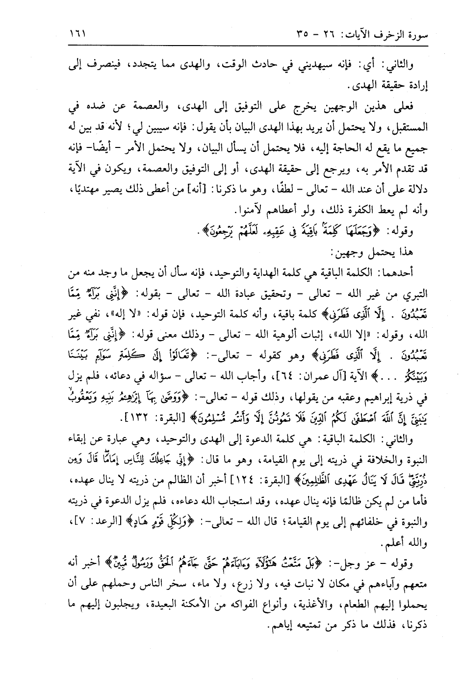 أحدهما: الكلمة الباقية هي كلمة الهداية والتوحيد، فإنه سأل أن يجعل ما وجد منه من التبري من غير اللَّه - تعالى - وتحقيق عبادة اللَّه - تعالى - بقوله: (إِنَّنِي بَرَاءٌ مِمَّا تَعْبُدُونَ. إِلَّا الَّذِي فَطَرَنِي) كلمة باقية، وأنه كلمة التوحيد، فإن قوله: " لا إله "، نفي غير اللَّه، وقوله: " إلا اللَّه "، إثبات ألوهية اللَّه - تعالى - وذلك معنى قوله: (إِنَّنِي بَرَاءٌ مِمَّا تَعْبُدُونَ. إِلَّا الَّذِي فَطَرَنِي) وهو كقوله - تعالى -: (تَعَالَوْا إِلَى كَلِمَةٍ سَوَاءٍ بَيْنَنَا وَبَيْنَكُمْ. . .) الآية، وأجاب اللَّه - تعالى - سؤاله في دعائه، فلم يزل في ذرية إبراهيم وعقبه من يقولها، وذلك قوله - تعالى -: (وَوَصَّى بِهَا إِبْرَاهِيمُ بَنِيهِ وَيَعْقُوبُ يَا بَنِيَّ إِنَّ اللَّهَ اصْطَفَى لَكُمُ الدِّينَ فَلَا تَمُوتُنَّ إِلَّا وَأَنْتُمْ مُسْلِمُونَ).