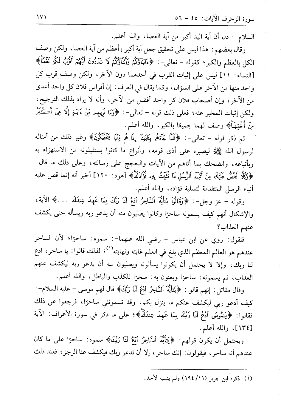 وقَالَ بَعْضُهُمْ: هذا ليس على تحقيق جعل آية أكبر وأعظم من آية العصا، ولكن وصف الكل بالعظم والكبر؛ كقوله - تعالى -: (آبَاؤُكُمْ وَأَبْنَاؤُكُمْ لَا تَدْرُونَ أَيُّهُمْ أَقْرَبُ لَكُمْ نَفْعًا)، ليس على إثبات القرب في أحدهما دون الآخر، ولكن وصف قرب كل واحد منها من الآخر على السؤال، وكما يقال في العرف: إن أفراس فلان كل واحد أعدى من الآخر، وإن أصحاب فلان كل واحد أفضل من الآخر، وأنه لا يراد بذلك الترجيح، ولكن إثبات المخبر عنه؛ فعلى ذلك قوله - تعالى -: (وَمَا نُرِيهِمْ مِنْ آيَةٍ إِلَّا هِيَ أَكْبَرُ مِنْ أُخْتِهَا) وصف لهما جميعًا بالكبر، واللَّه أعلم.