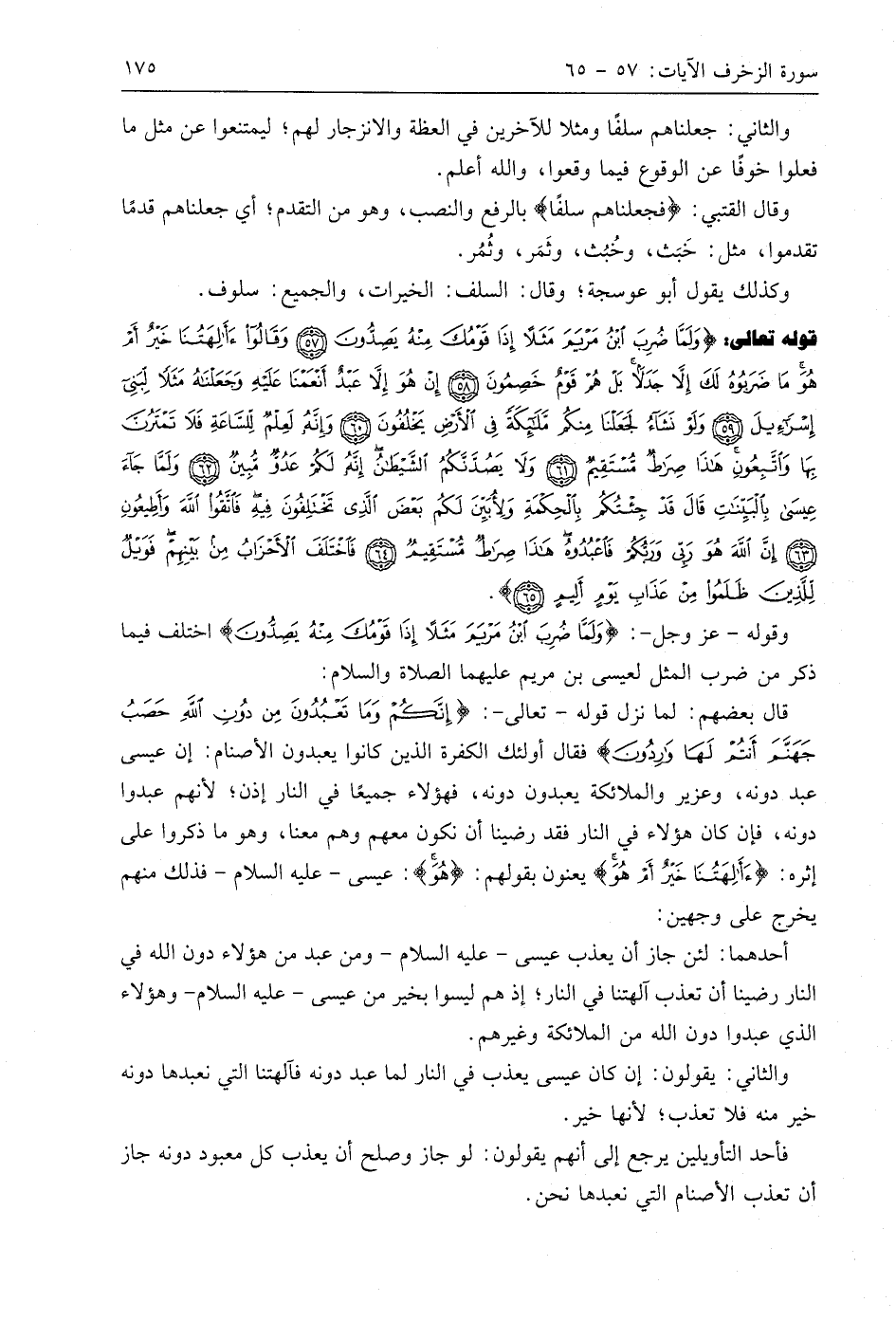 قوله تعالى: (وَلَمَّا ضُرِبَ ابْنُ مَرْيَمَ مَثَلًا إِذَا قَوْمُكَ مِنْهُ يَصِدُّونَ (57) وَقَالُوا أَآلِهَتُنَا خَيْرٌ أَمْ هُوَ مَا ضَرَبُوهُ لَكَ إِلَّا جَدَلًا بَلْ هُمْ قَوْمٌ خَصِمُونَ (58) إِنْ هُوَ إِلَّا عَبْدٌ أَنْعَمْنَا عَلَيْهِ وَجَعَلْنَاهُ مَثَلًا لِبَنِي إِسْرَائِيلَ (59) وَلَوْ نَشَاءُ لَجَعَلْنَا مِنْكُمْ مَلَائِكَةً فِي الْأَرْضِ يَخْلُفُونَ (60) وَإِنَّهُ لَعِلْمٌ لِلسَّاعَةِ فَلَا تَمْتَرُنَّ بِهَا وَاتَّبِعُونِ هَذَا صِرَاطٌ مُسْتَقِيمٌ (61) وَلَا يَصُدَّنَّكُمُ الشَّيْطَانُ إِنَّهُ لَكُمْ عَدُوٌّ مُبِينٌ (62) وَلَمَّا جَاءَ عِيسَى بِالْبَيِّنَاتِ قَالَ قَدْ جِئْتُكُمْ بِالْحِكْمَةِ وَلِأُبَيِّنَ لَكُمْ بَعْضَ الَّذِي تَخْتَلِفُونَ فِيهِ فَاتَّقُوا اللَّهَ وَأَطِيعُونِ (63) إِنَّ اللَّهَ هُوَ رَبِّي وَرَبُّكُمْ فَاعْبُدُوهُ هَذَا صِرَاطٌ مُسْتَقِيمٌ (64) فَاخْتَلَفَ الْأَحْزَابُ مِنْ بَيْنِهِمْ فَوَيْلٌ لِلَّذِينَ ظَلَمُوا مِنْ عَذَابِ يَوْمٍ أَلِيمٍ (65)