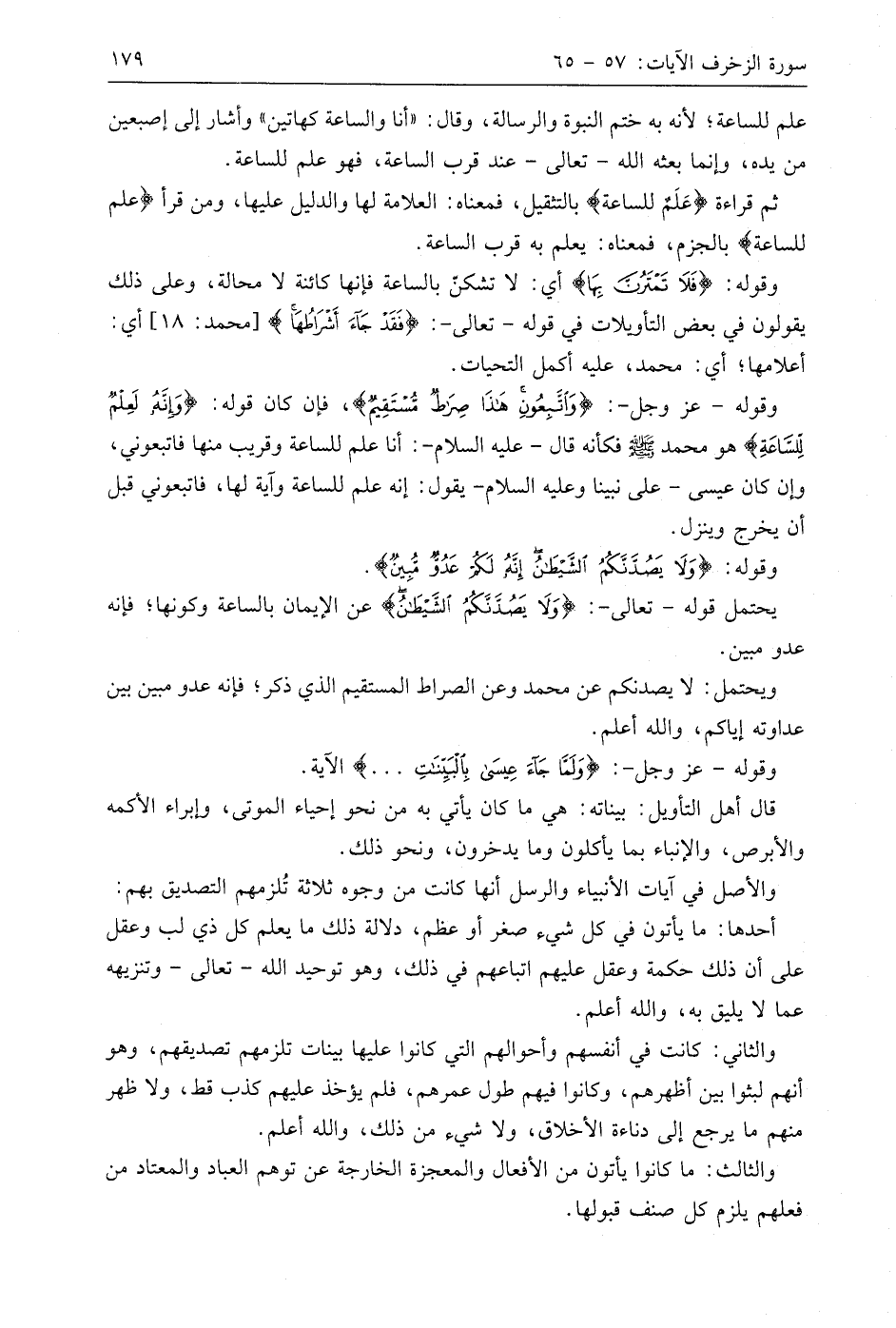 ثم قراءة (عَلَمٌ لِلسَّاعَةِ) بالتثقيل، فمعناه: العلامة لها والدليل عليها، ومن قرأ (عِلْمٌ لِلسَّاعَةِ) بالجزم، فمعناه: يعلم به قرب الساعة.